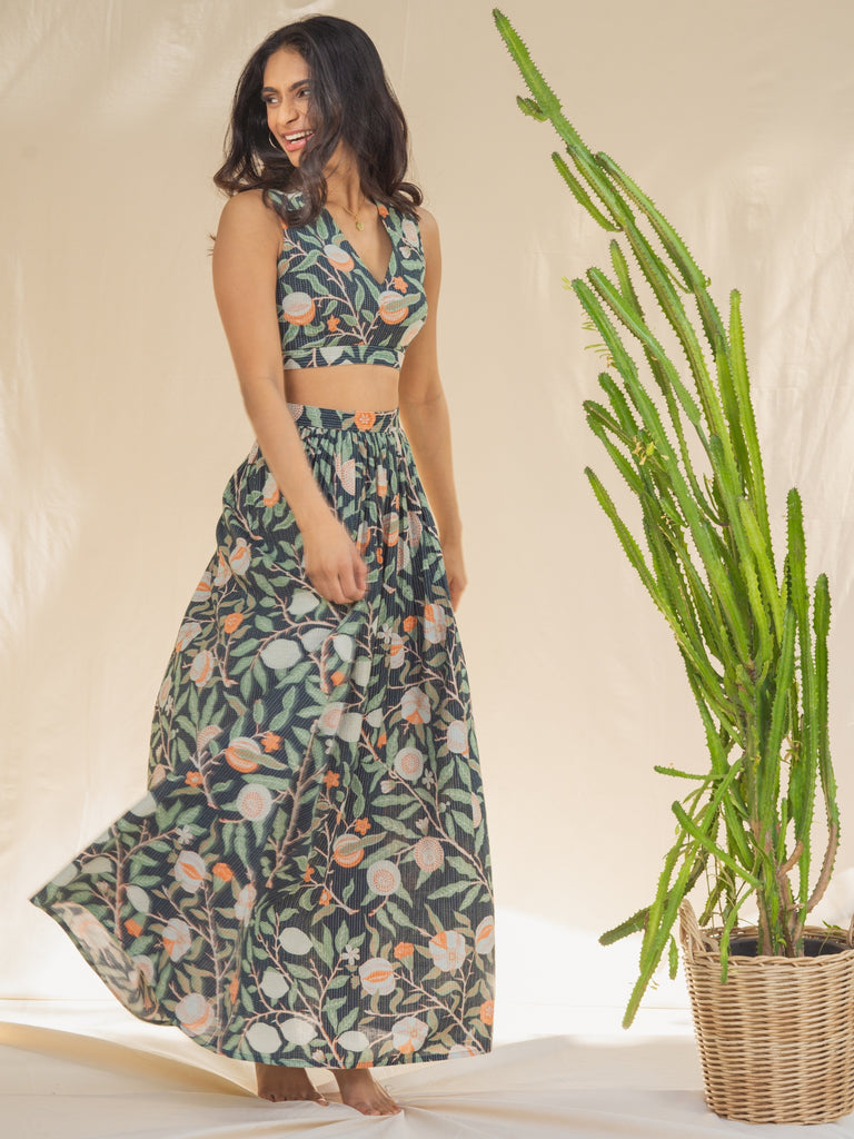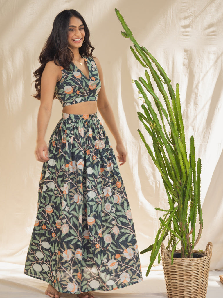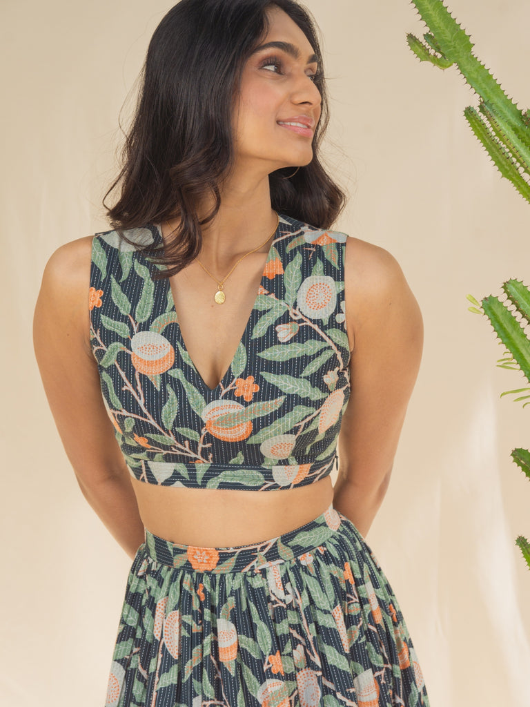 Make a statement with our Alice Kantha Skirt Set - the perfect addition to your summer wardrobe. Crafted in a beautiful floral printed fabric with azo-free dyes, this set is not only stylish but also eco-friendly. The set features a padded crop top with a flattering silhouette and a comfortable fit. Paired with a gathered belted maxi skirt that accentuates your figure and has pockets, you'll be sure to turn heads wherever you go. The kantha stitches adds a touch of bohemian flair, while the soft and breathable fabric ensures that you stay cool and comfortable all day long. Shop co-ord sets today