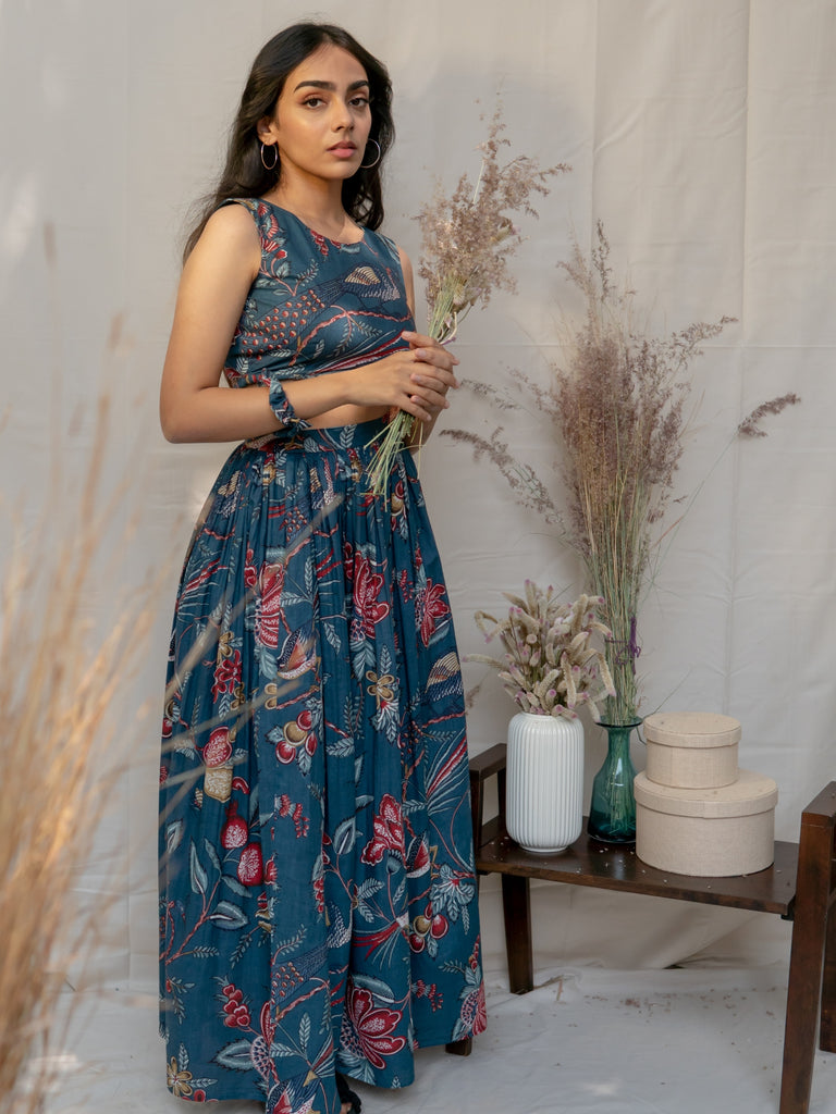 Indulge in sophisticated summer style with the Amira Skirt Set, a luxurious co-ord perfect for resort wear and vacations. Crafted from soft cotton and featuring exquisite floral block prints, this set boasts a truly unique charm from Jaipur, India. The sleeveless crop top offers a chic boat neck and a convenient side zipper closure. Paired with a full-length, belted gathered skirt, the rich colors and intricate prints give this ensemble a truly classy and opulent look.