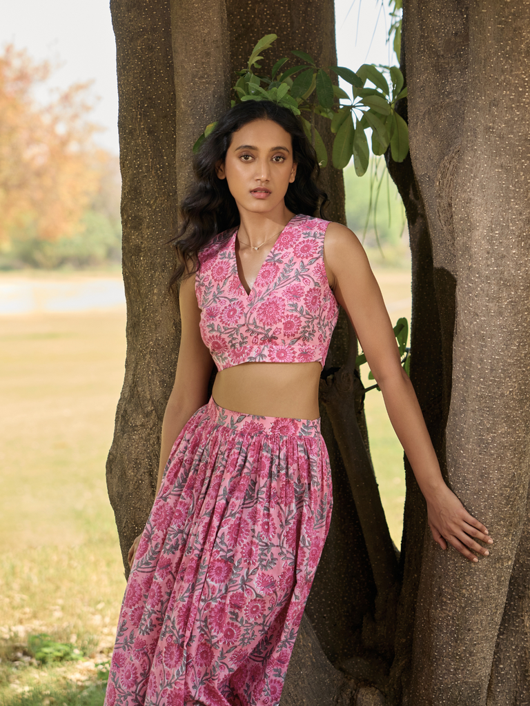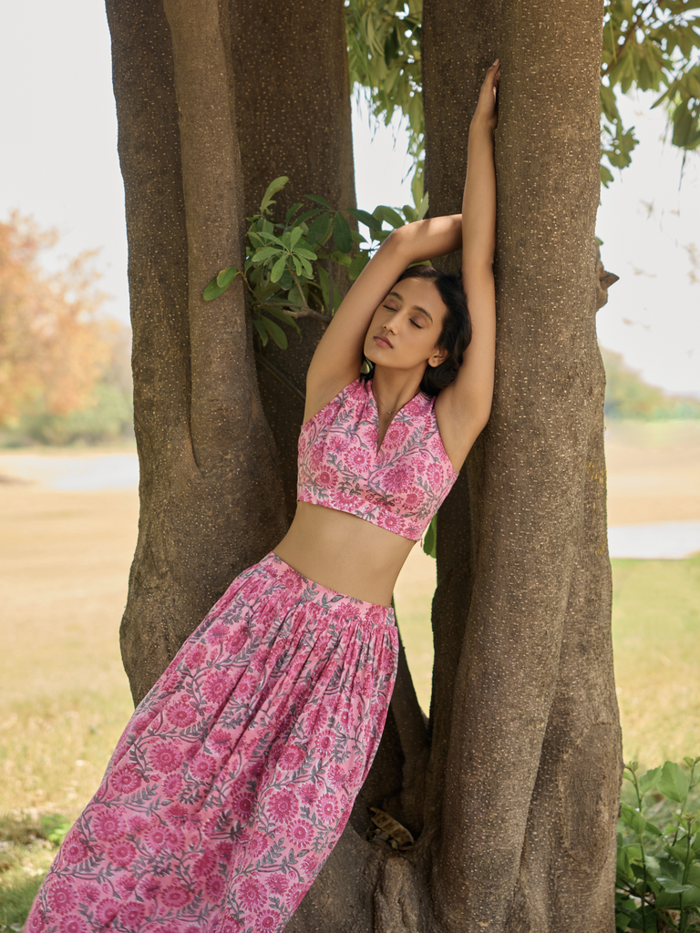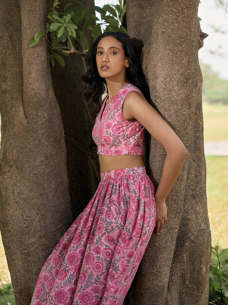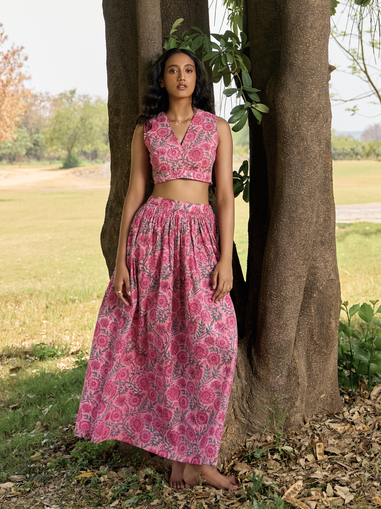 The Anya Skirt Set is a vibrant two-piece ensemble featuring a bold floral pattern. The sleeveless crop top is designed for a comfortable fit, while the gathered maxi skirt flows gracefully to create an effortlessly chic look. For added convenience, the skirt is equipped with practical pockets, making this stylish set as functional as it is fashionable.
