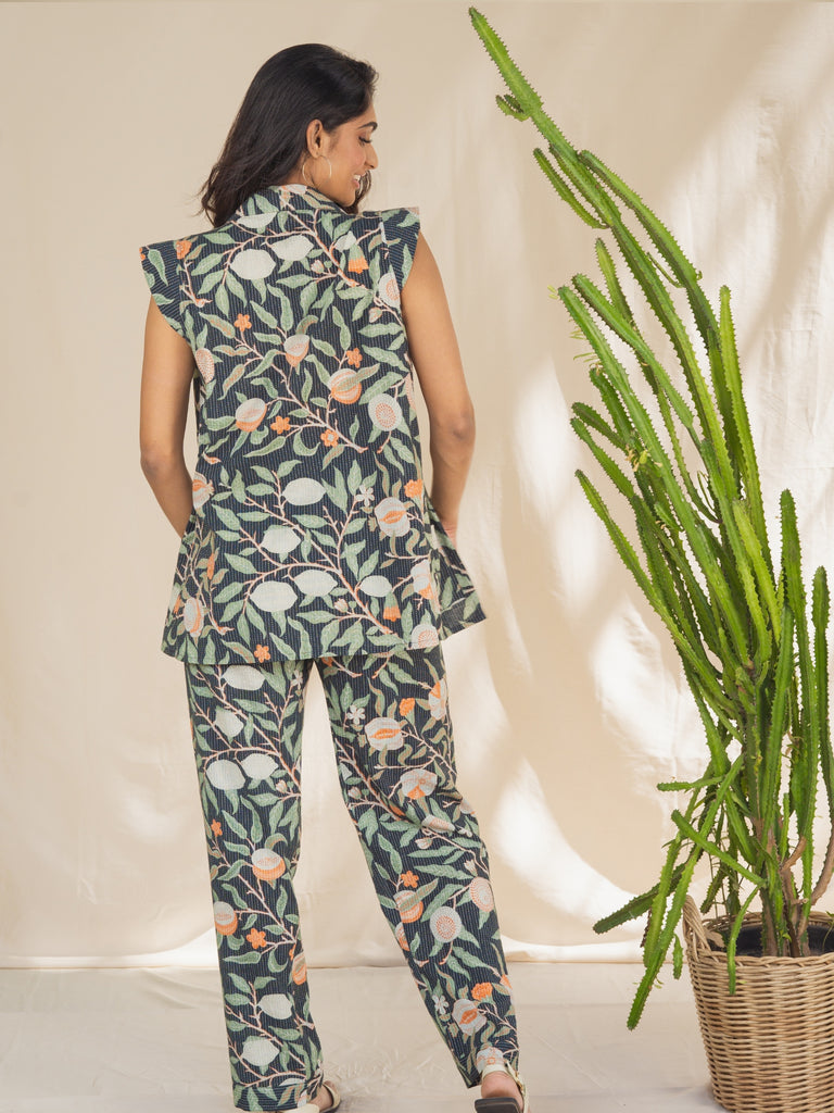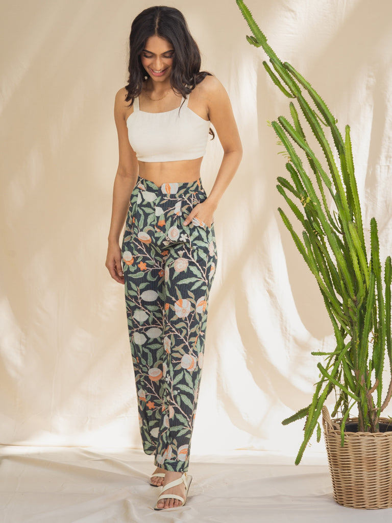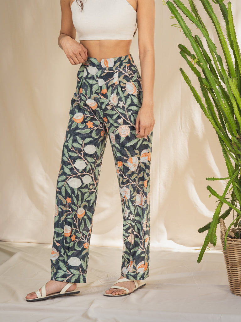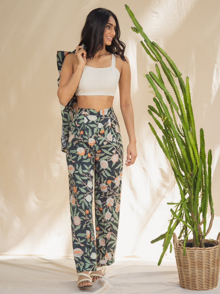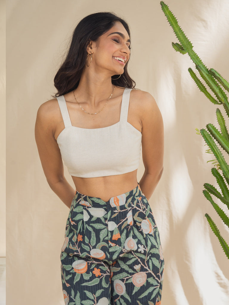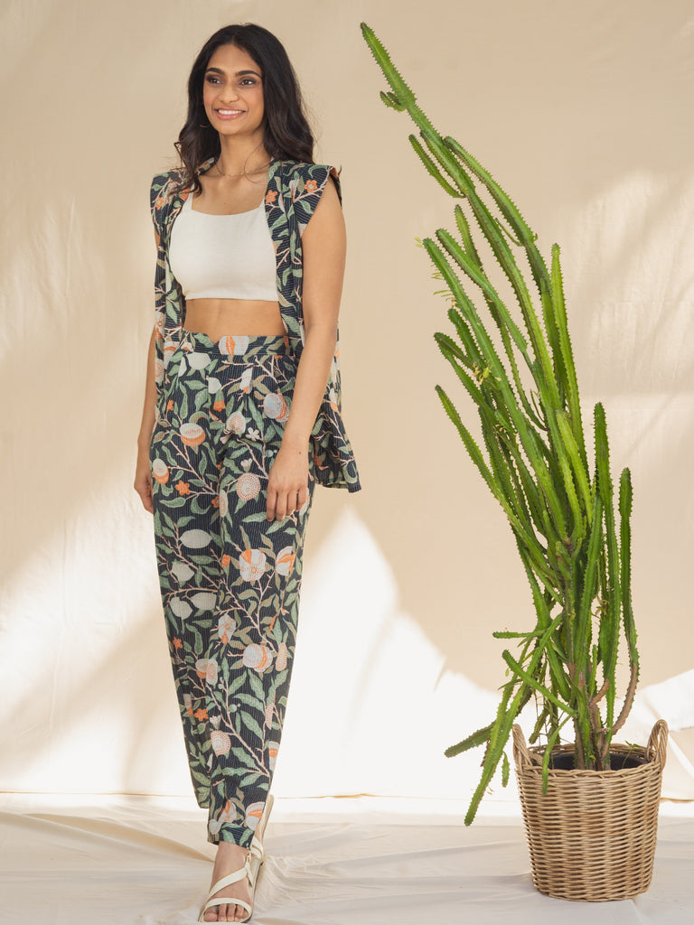 Elevate your summer wardrobe with our stunning Sage Pant Set. Crafted in a breathable cotton fabric, this set is perfect for staying comfortable and stylish in warmer weather. The set features a kantha style threading that adds a touch of traditional elegance to the modern design. The open jacket features a beautiful floral print and is perfect for layering over the beige cotton linen strap style crop top, which is highlighted with a contrast beige color. The trousers feature a belt detailing that accentuates your figure and completes the set. Shop Versatile Pant Sets Now