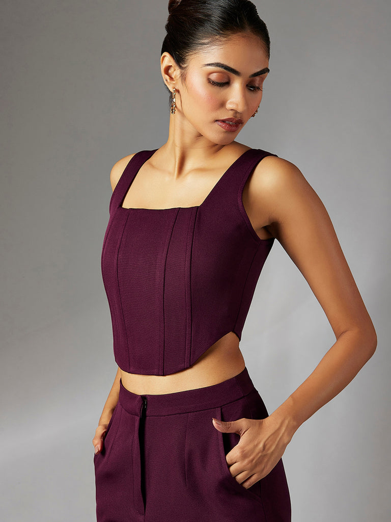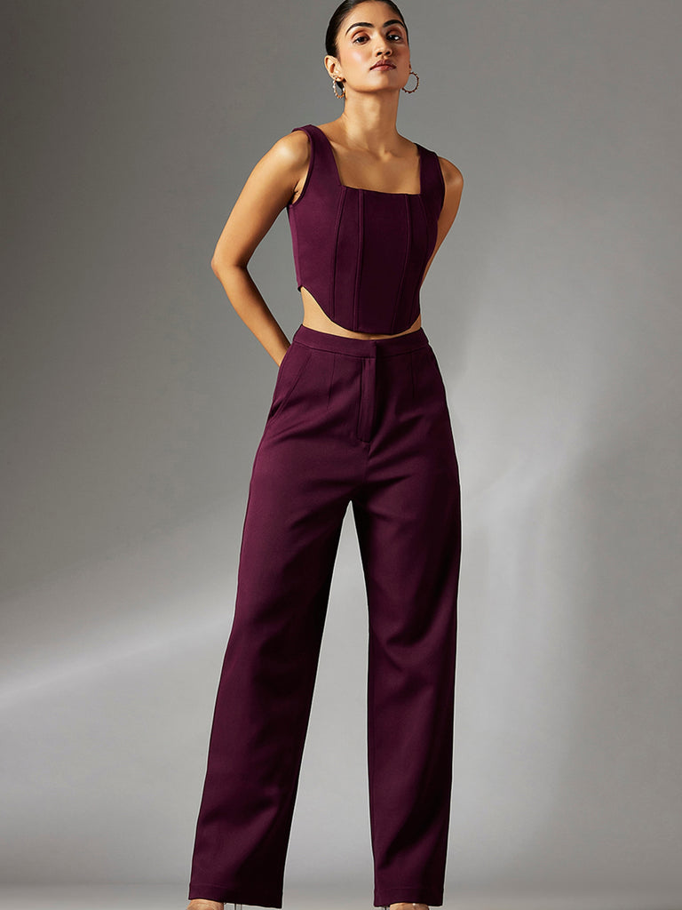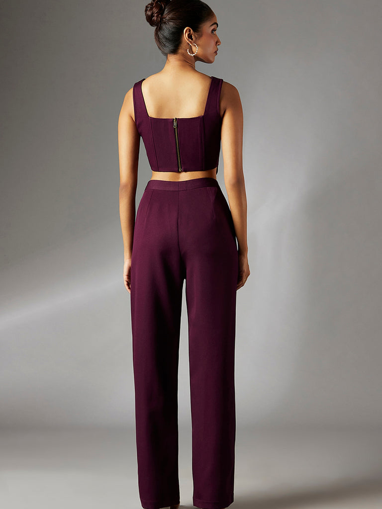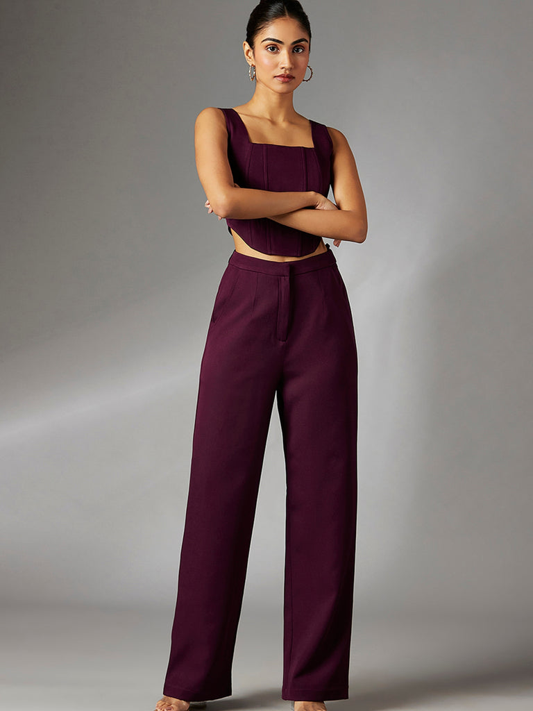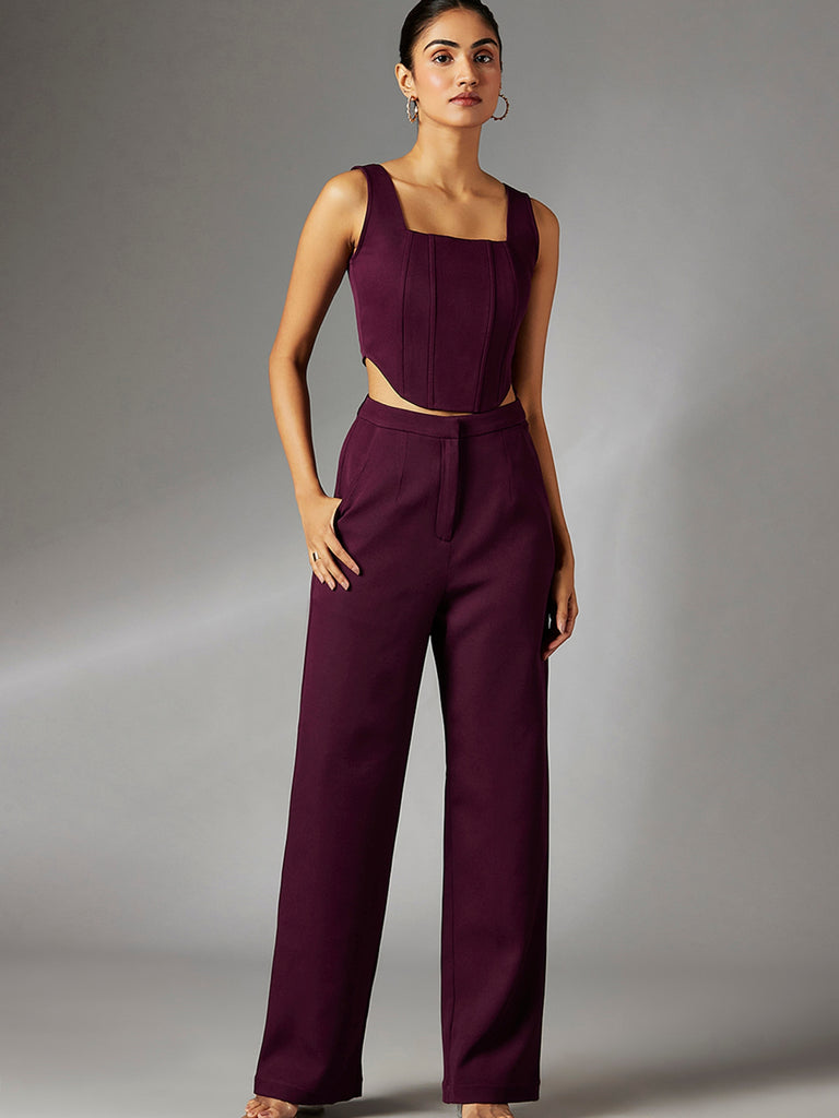 Make a bold and sophisticated statement with the Plum Power Set. This coordinated ensemble features a structured deep plum corset top and matching straight-fit trousers, both crafted from luxurious Italian banana crepe. The intricate detailing of the corset top creates a captivating focal point, while the tailored trousers offer a sleek and polished silhouette. Perfect for confident workwear and stylish evening events.