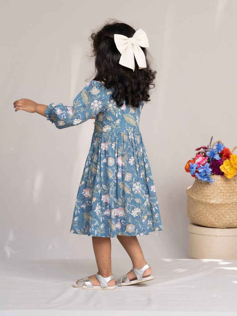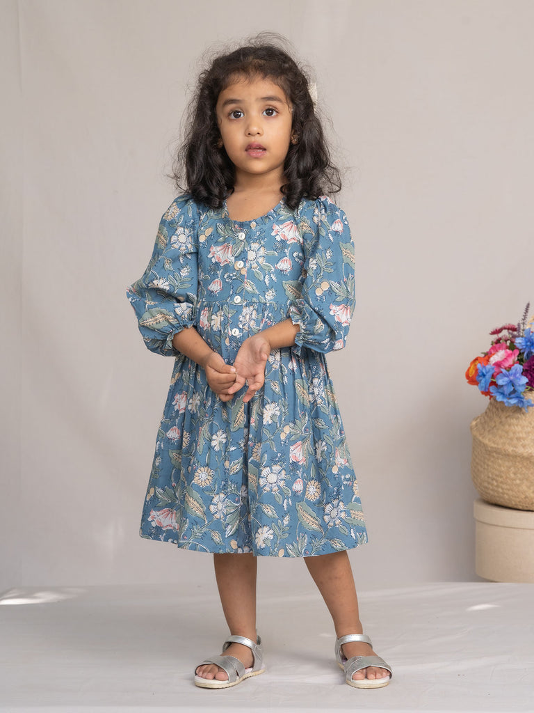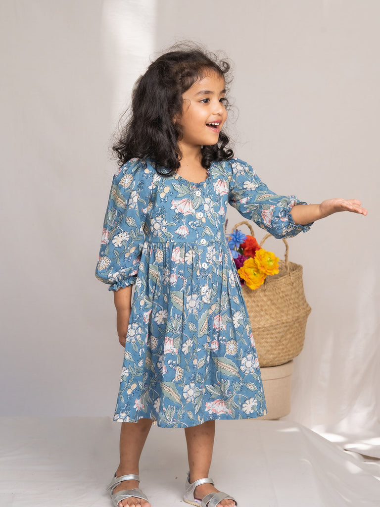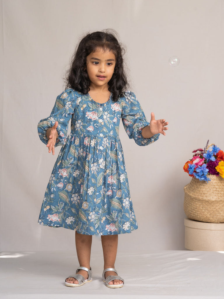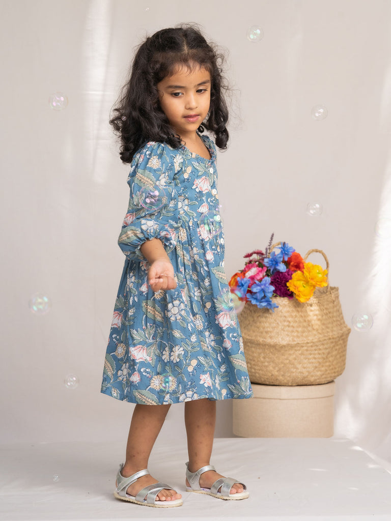 Our Amelia Dress is a must for your kids wardrobe. It features a ruffle Neckline with front opening and ruffle hem sleeves. Crafted In a soft teal block printed cotton fabric is the perfect picnic dress. Shop Sustainable Kids Wear.