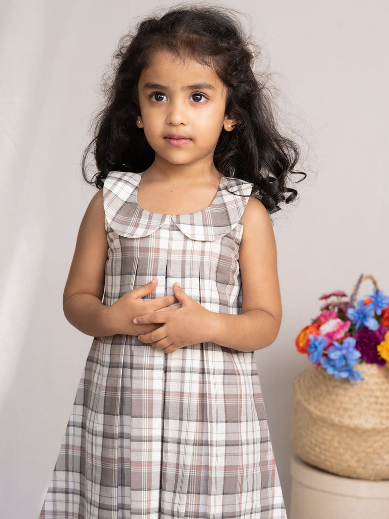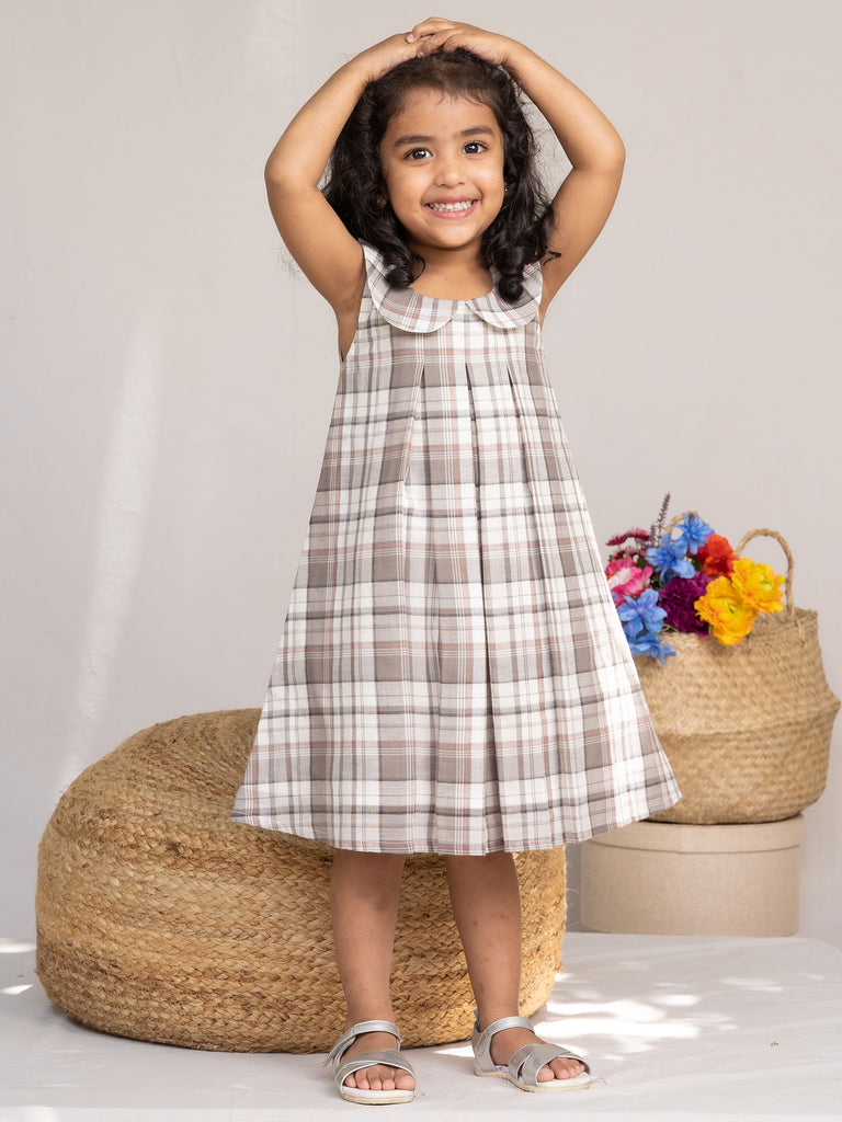 Elevate your little girls style with our Betsy Dress. This soft cotton plaid pattern dress has a pleated front along with a peter pan collar & button opening in the back for a comfortable fit. Shop Sustainable Kids Wear.