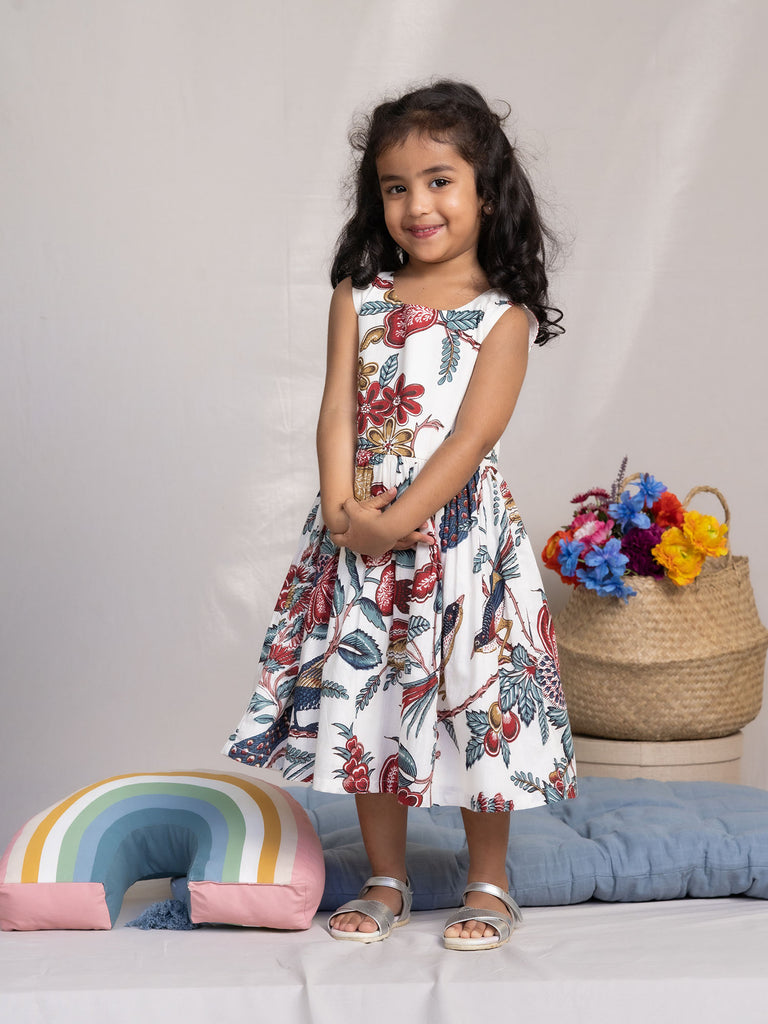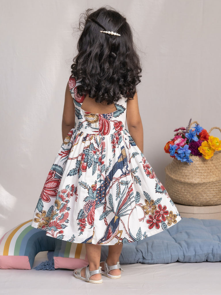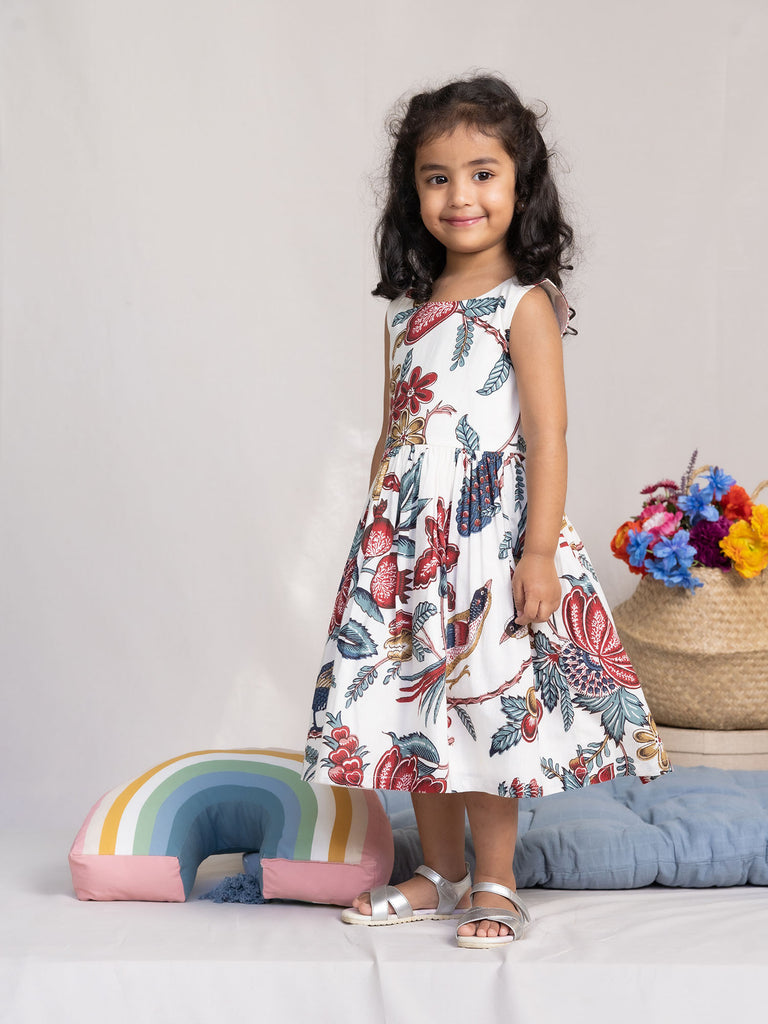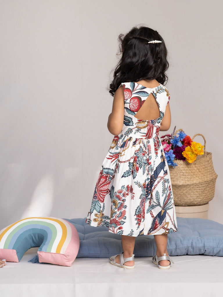 Crafted in a pure cotton block printed fabric our print features peacocks & flowers adding a little whimsy to the dress. It features a cut out in the back along with back button opening. Style with flats & earrings for a playdate with her buddies. Shop Sustainable Kids Wear.