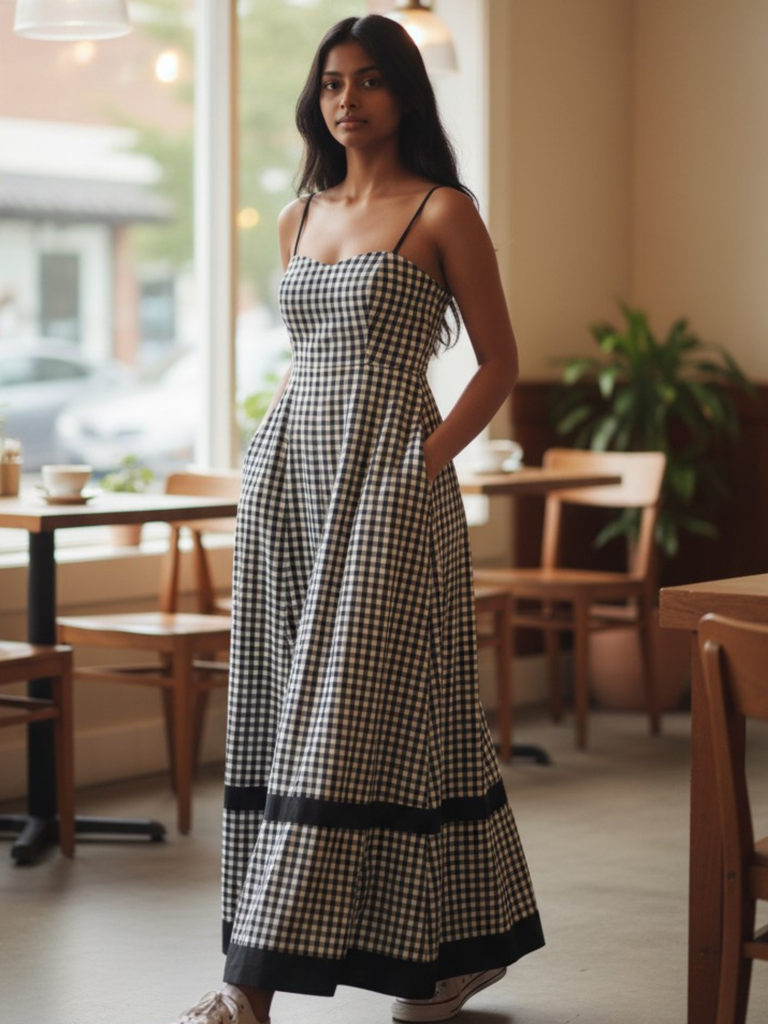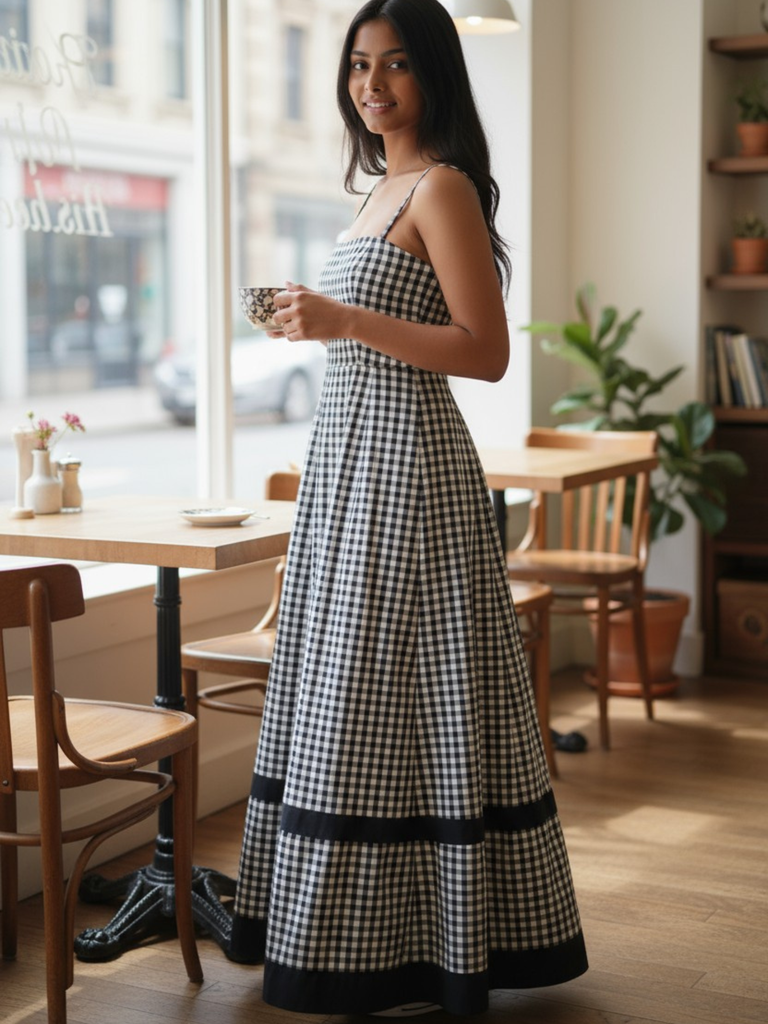 Make a modern statement in The Caroline Designer Gingham Dress. This exclusive stylish long dress showcases a perfectly balanced black and white gingham print with a sophisticated, modern silhouette. The design includes a fitted bodice, elegant contrast black straps, and a dramatic full-length skirt, accented by a striking black border. Perfect for brunch, high tea, or any occasion where effortless style is a must.