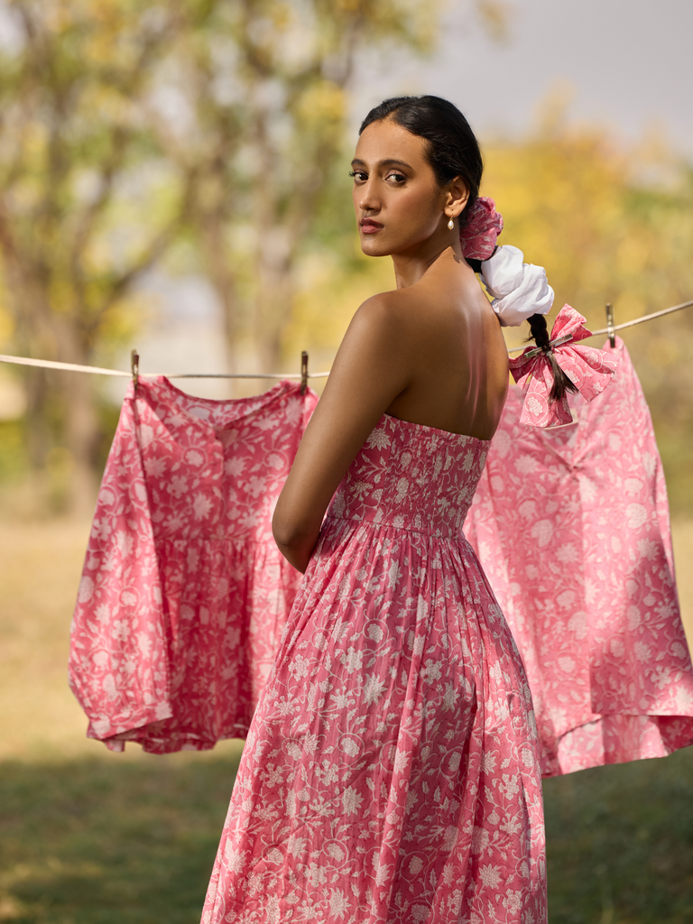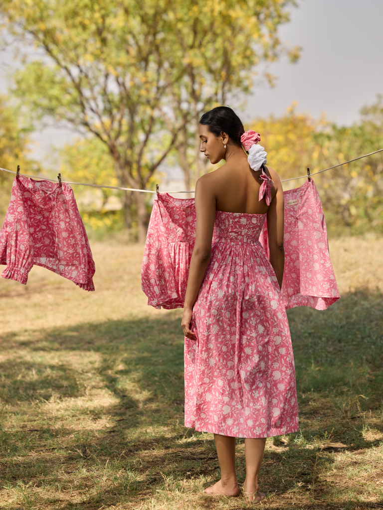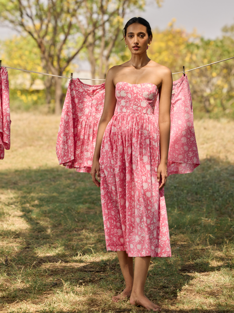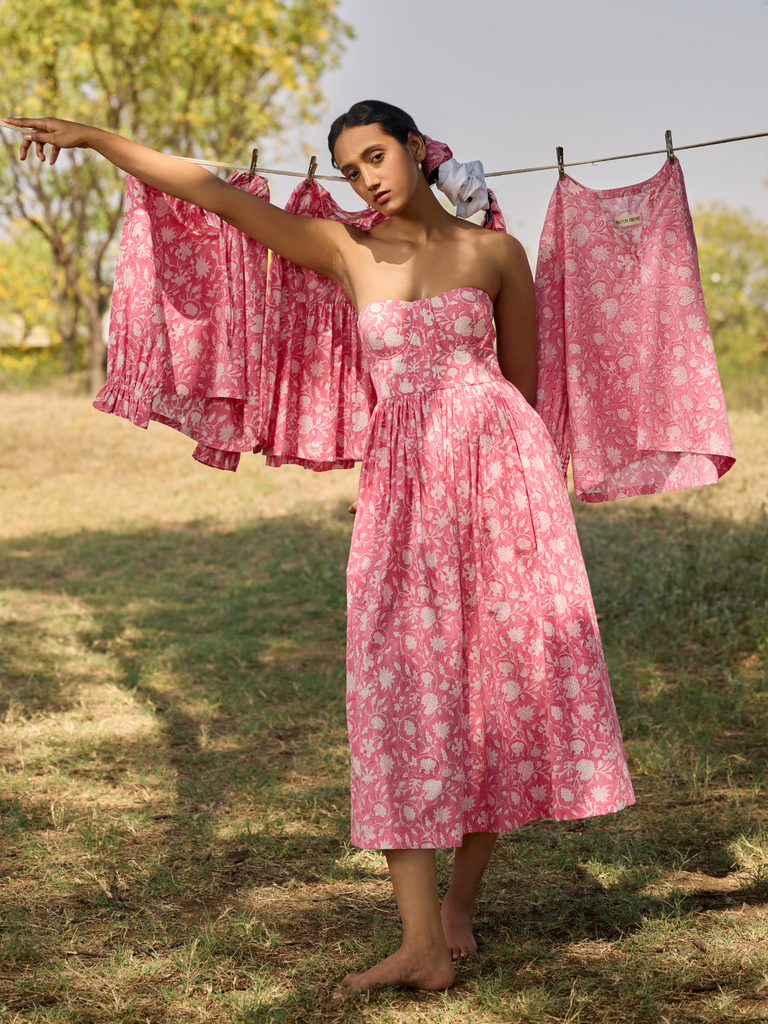 Introducing the Madison, an exquisite corset dress that blends vintage-inspired charm with modern sophistication. The delicate pink block print is complemented by expertly crafted boning and supportive underwire, designed to sculpt a stunning hourglass figure. Made from pure cotton for ultimate comfort, this dress also features convenient hidden pockets. Whether for brunch or a special occasion, the Madison corset dress offers a versatile and timeless addition to your wardrobeinvestment in timeless style and feminine allure.