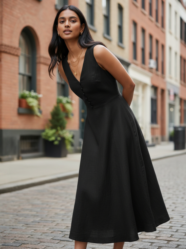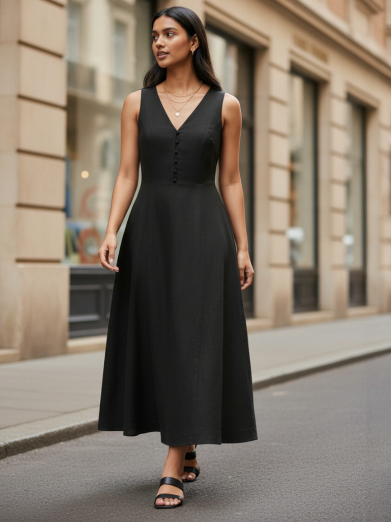 Discover the perfect fusion of comfort and classic elegance with the Black Rory Midi Dress. This essential sleeveless A-line dress is expertly crafted from soft, pure handwoven ikat cotton, offering a breathable feel and subtle, rich texture that elevates the traditional black midi. Designed for a flattering fit, the dress features a sophisticated V-neckline and is detailed with a column of delicate functional buttons leading down the bodice, accentuating the defined waist. Effortlessly transitioning from an important meeting to a stylish date night, the Rory Dress proves that comfort and high style can seamlessly coexist.