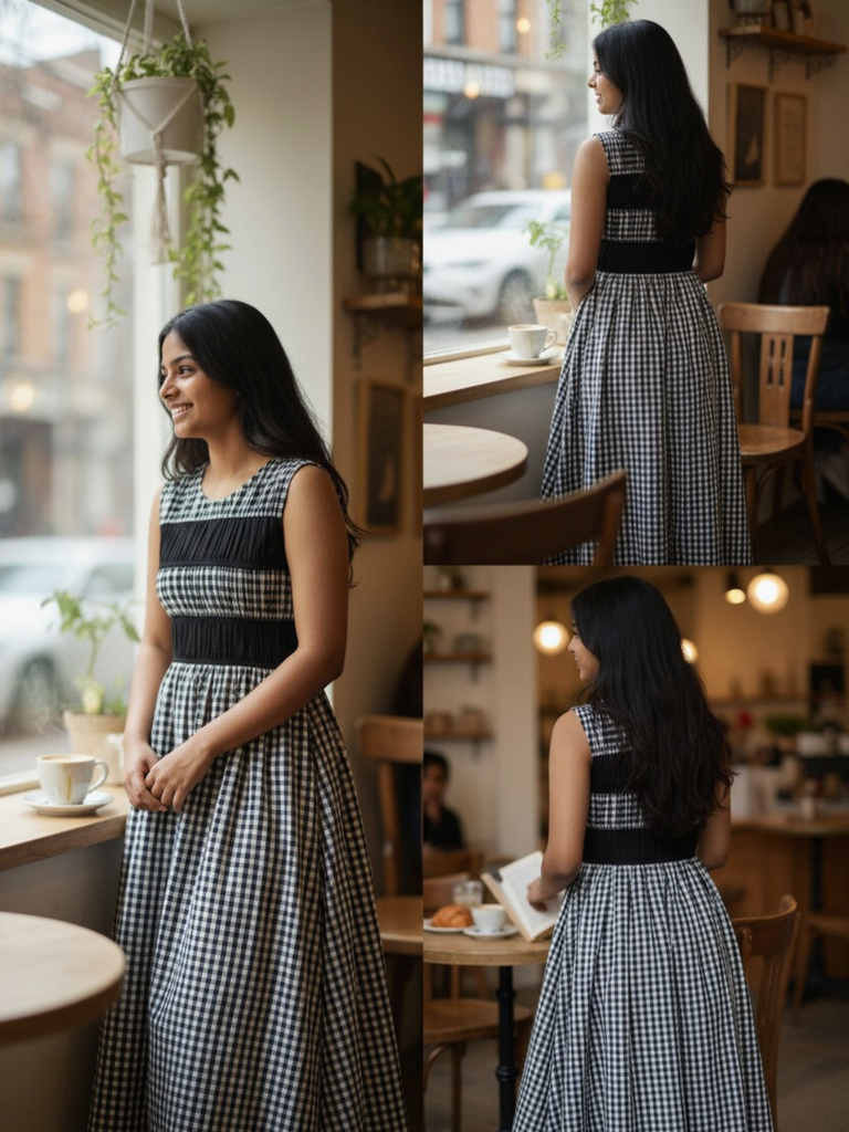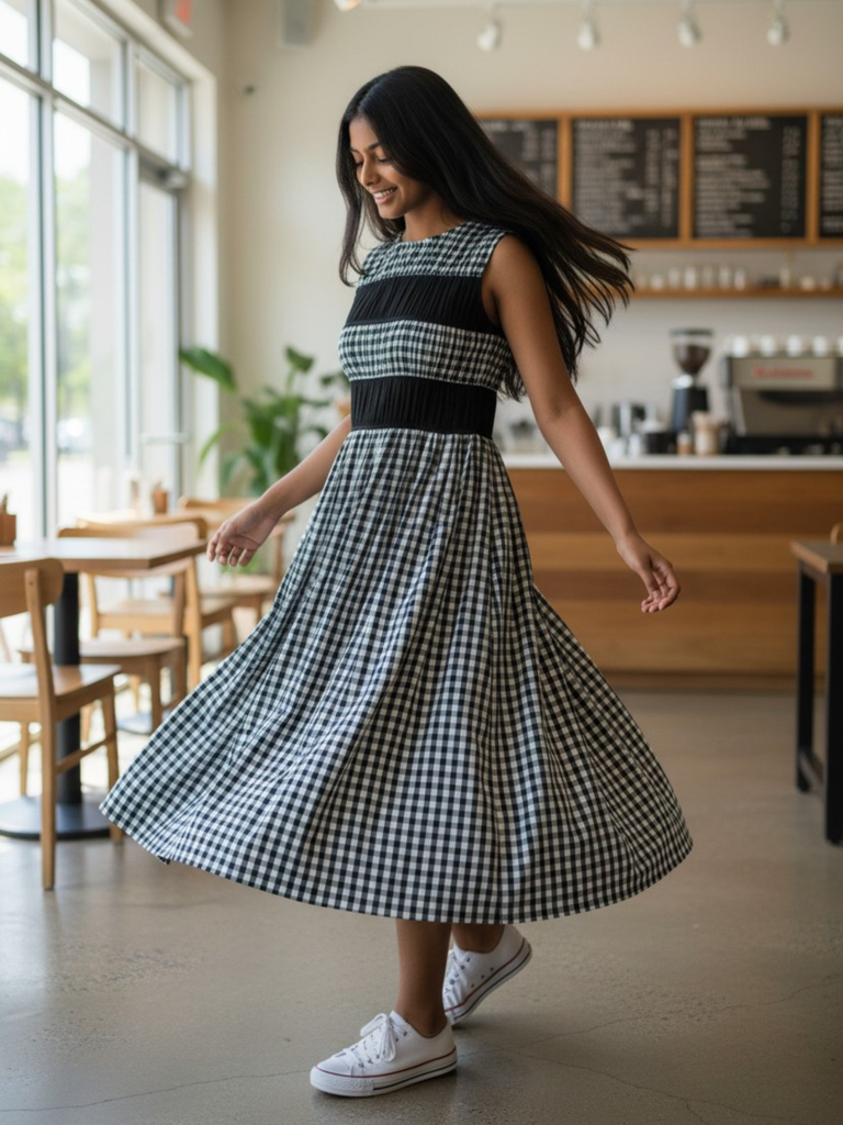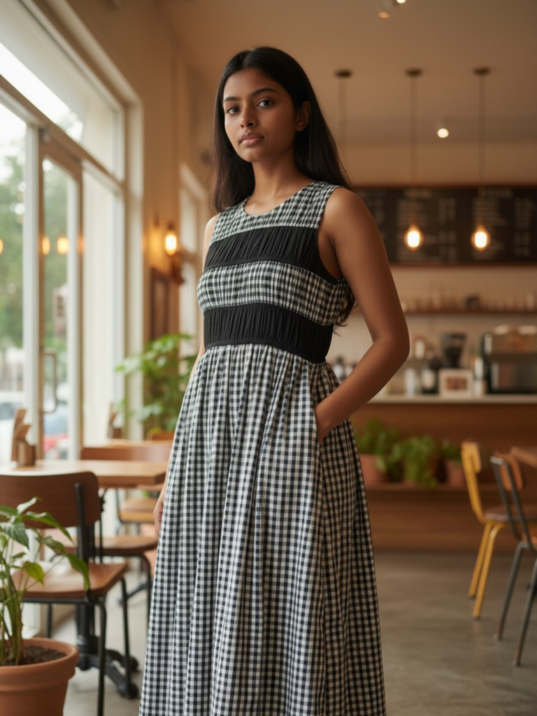 Step into classic charm with the Ruru Gingham Midi Dress. This effortlessly chic piece is designed to capture attention, featuring a crisp, timeless black and white gingham pattern. The sophisticated sleeveless silhouette is perfectly balanced by a bold, black shirred waistband that cinches in for a flattering, defined shape. Crafted for comfort and style, the Ruru is fully date-night ready and—best of all—comes equipped with the essential pockets. Pair it with heels for an evening out or sandals for brunch; either way, this dress is your new go-to for polished perfection. Shop Notch Above Dresses