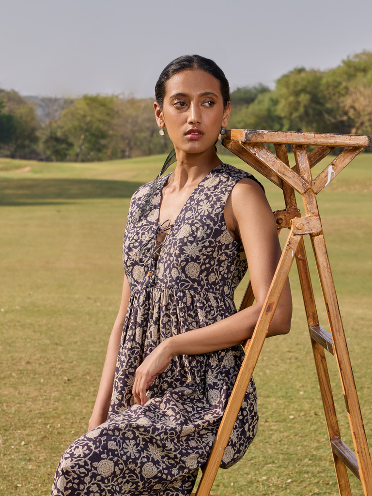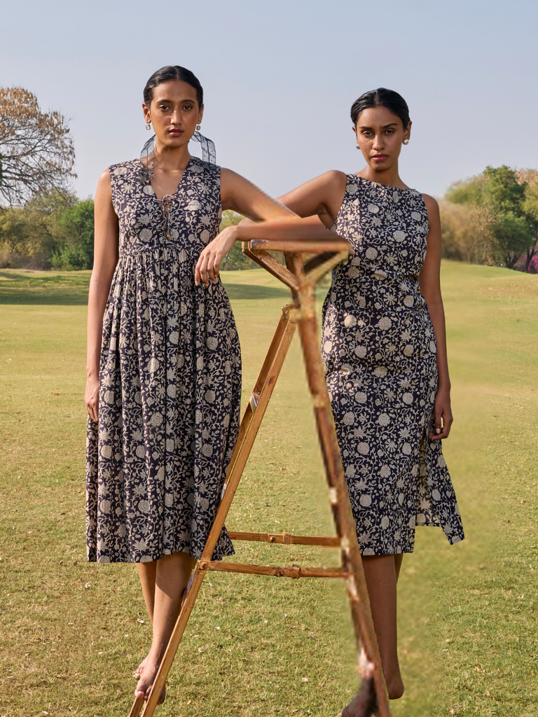 Discover the striking elegance of the Erica Riveted Midi Dress. Crafted in a sophisticated black block print on soft cotton, this sleeveless dress offers both comfort and structure. The flattering gathered bodice cinches the waist before seamlessly transitioning into a gently flared skirt—a silhouette designed to celebrate every figure. Unique rivet detailing subtly accents the V-neckline, lending a charming, unexpected edge to this beautifully tailored piece.