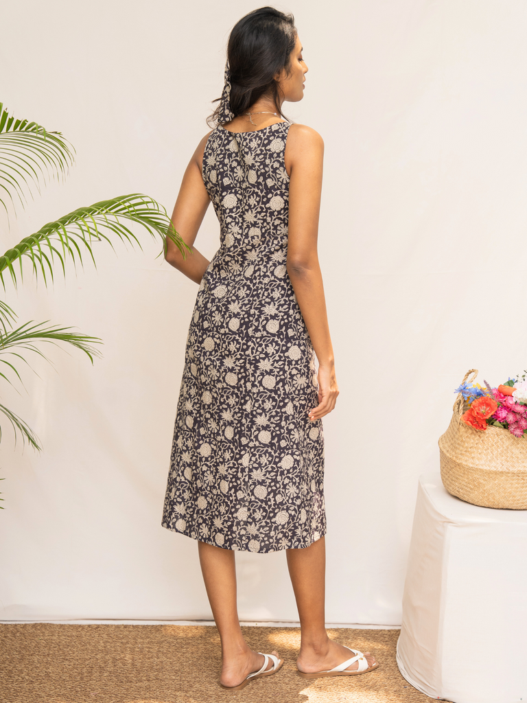 Discover understated elegance with the Jane Boat Neck Midi Dress. The beautiful black floral print on soft cotton makes this midi a wardrobe essential. The classic boat neckline and subtle front slit add a touch of effortless sophistication to this vintage-inspired piece.