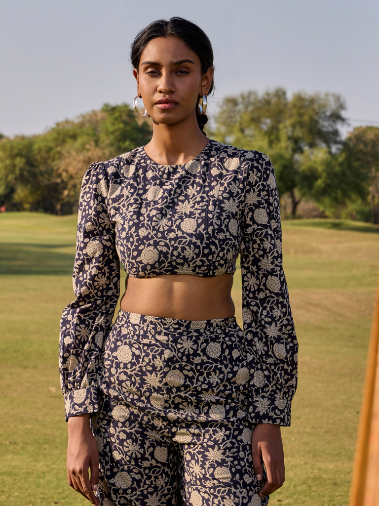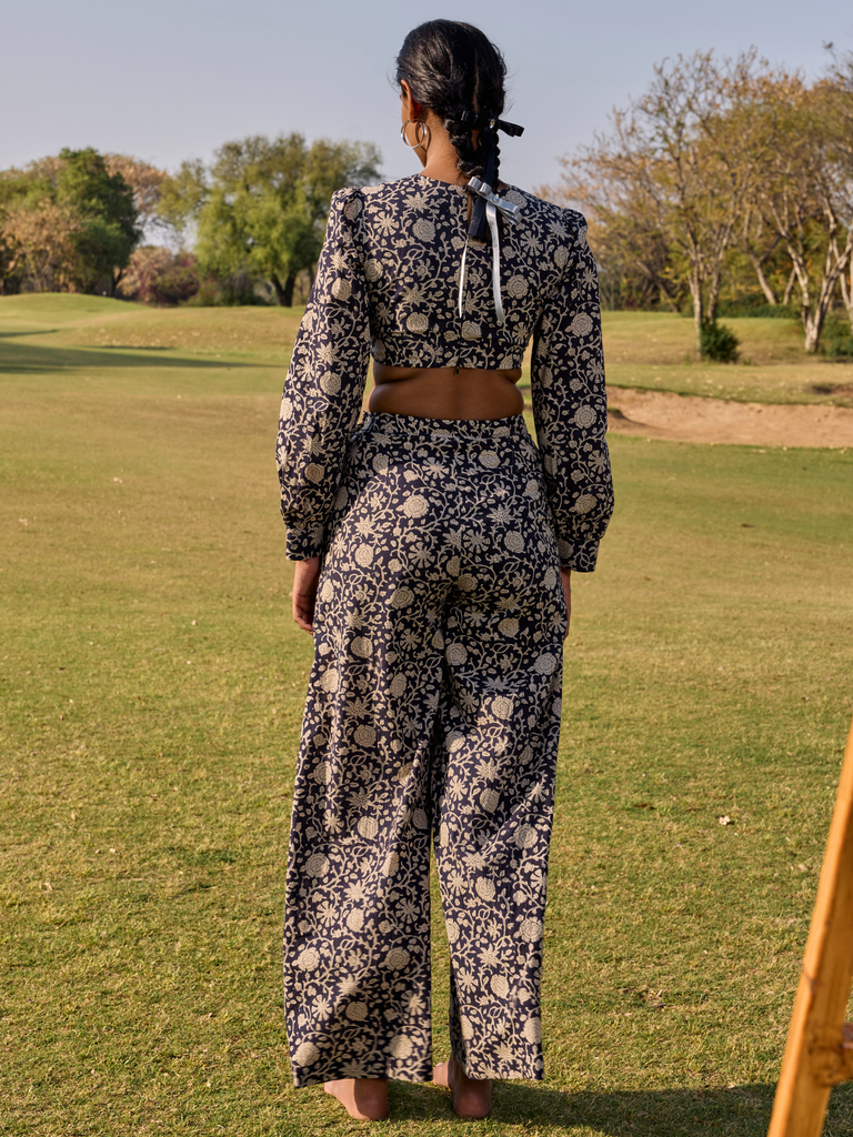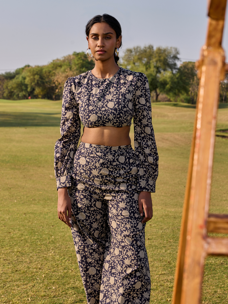 Discover ultimate comfort and effortless style with the Natalia Co-ord Pant Set, perfect for your next vacation or travel day. Crafted from soft cotton featuring a beautiful hand block print in a sophisticated dark hue with delicate lighter floral motifs, this set offers unique charm. The ensemble includes a chic long-sleeve crop top and comfortable wide-leg pants, designed for a relaxed yet stylish fit. Embrace the ease of a matching set while exploring new destinations or enjoying a laid-back day.
