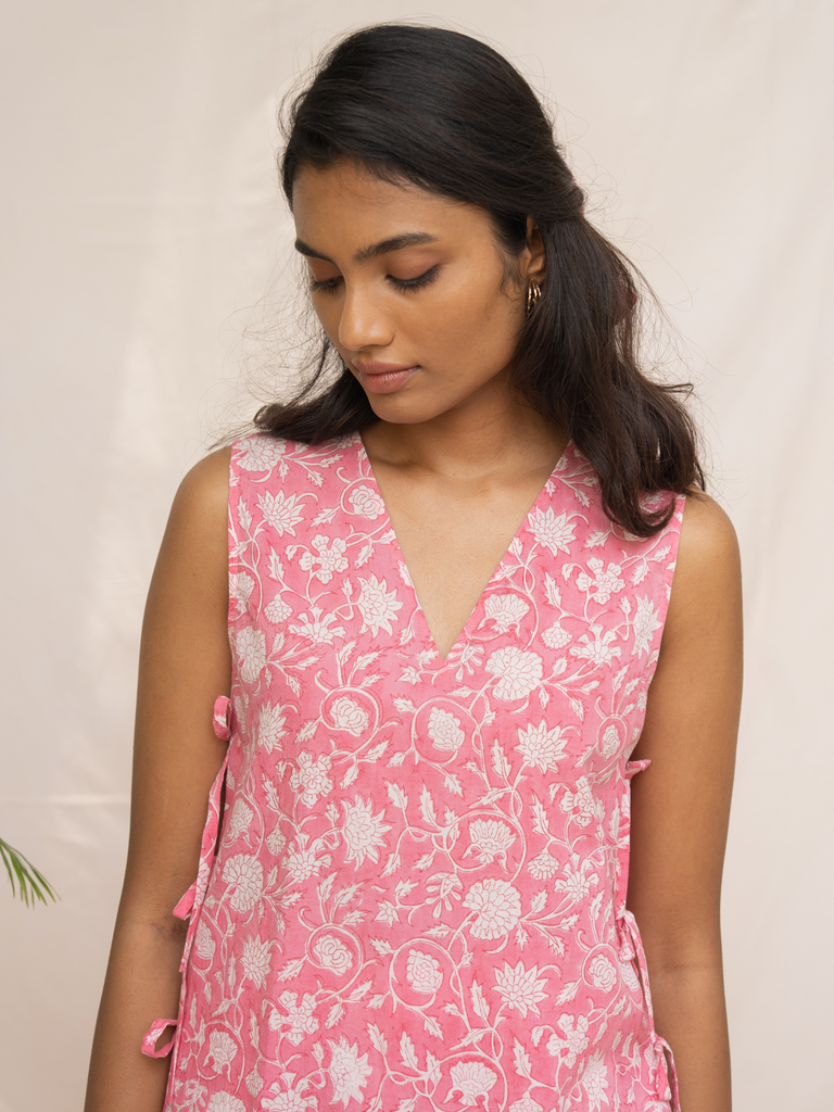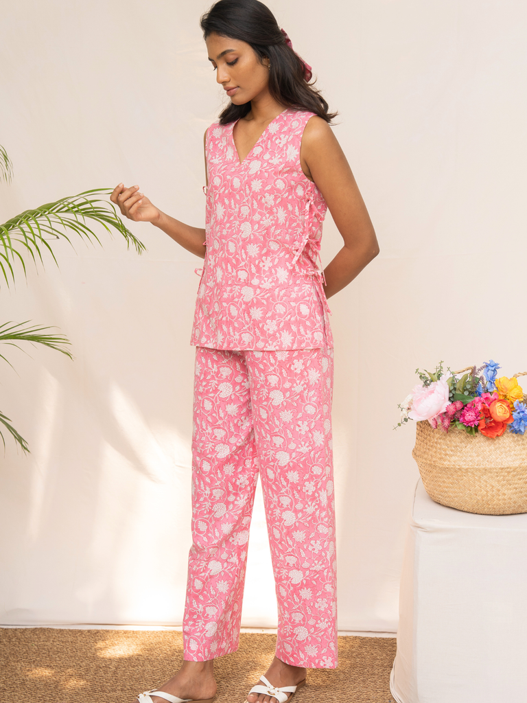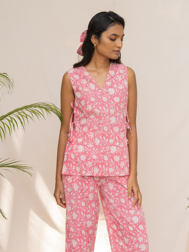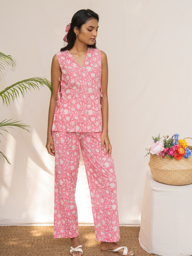 Effortless elegance, simplified. Meet the Quinn Co-ord Set, your new uniform for easy style. Crafted in soft, printed cotton, this versatile set features a chic V-neck top with playful side tie-ups and perfectly relaxed-fit pants. Just slip it on and go—comfort never looked so good.