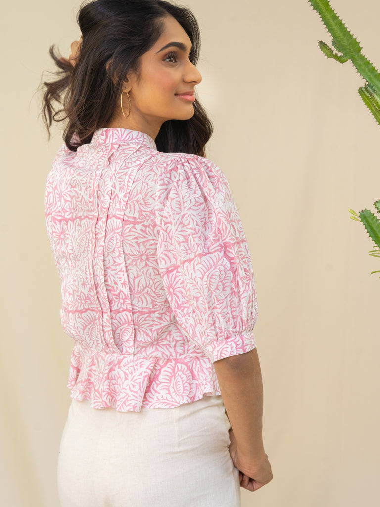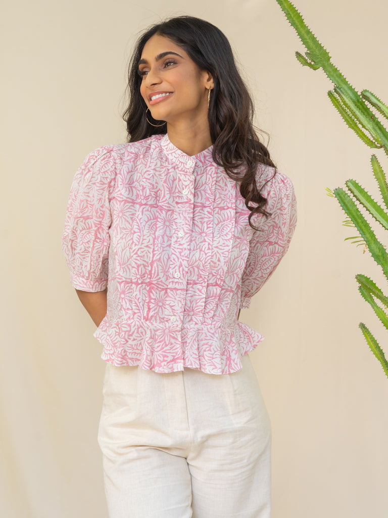 Introducing our Layla Pleated Top - a versatile piece that combines comfort and style effortlessly. Crafted in a hand block printed fabric from Jaipur. The pleated detailing adds texture and depth to the design, while the ruffle hem adds a feminine touch. The half sleeves provide coverage while keeping you cool and comfortable in warm weather. With its front opening and relaxed fit, this top is easy to wear and can be styled in a variety of ways.