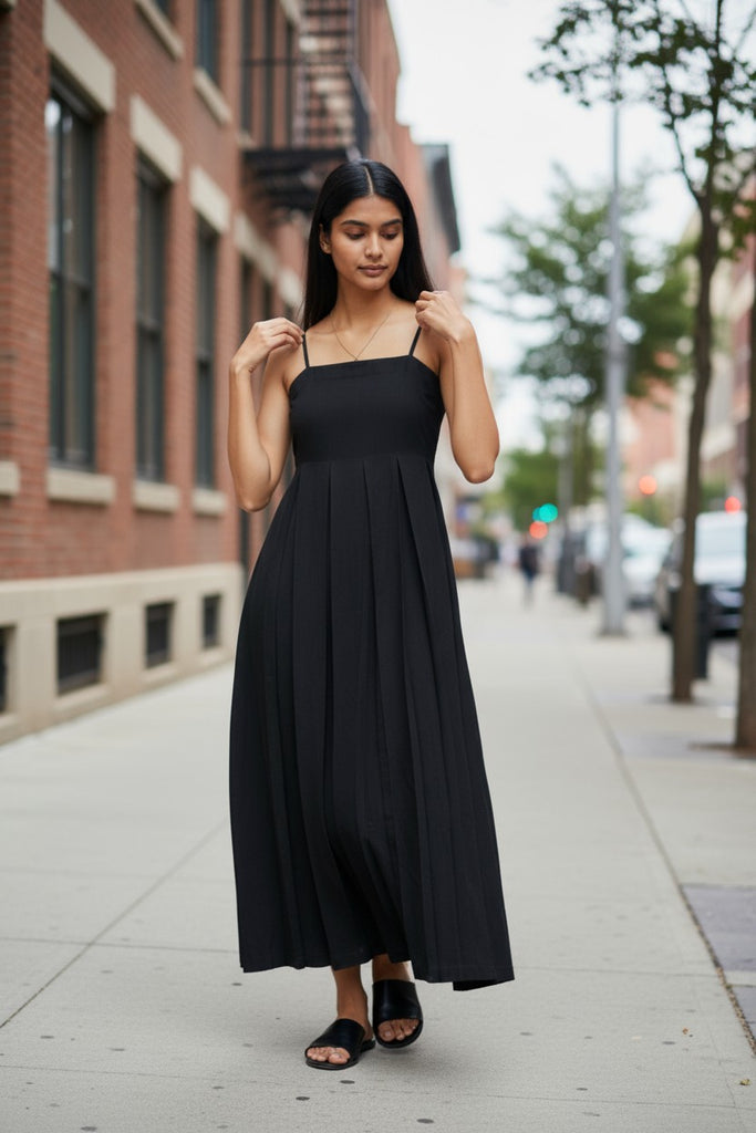 Make a statement in the classic and sophisticated Pia Dress. This midi dress features a strap style and wide box pleats, offering a comfortable and flattering fit. Crafted in a handwoven cotton fabric, the Pia Dress is both stylish and sustainable. So why wait? Add this must-have dress to your wardrobe today and enjoy effortless style that's both comfortable and sustainable.