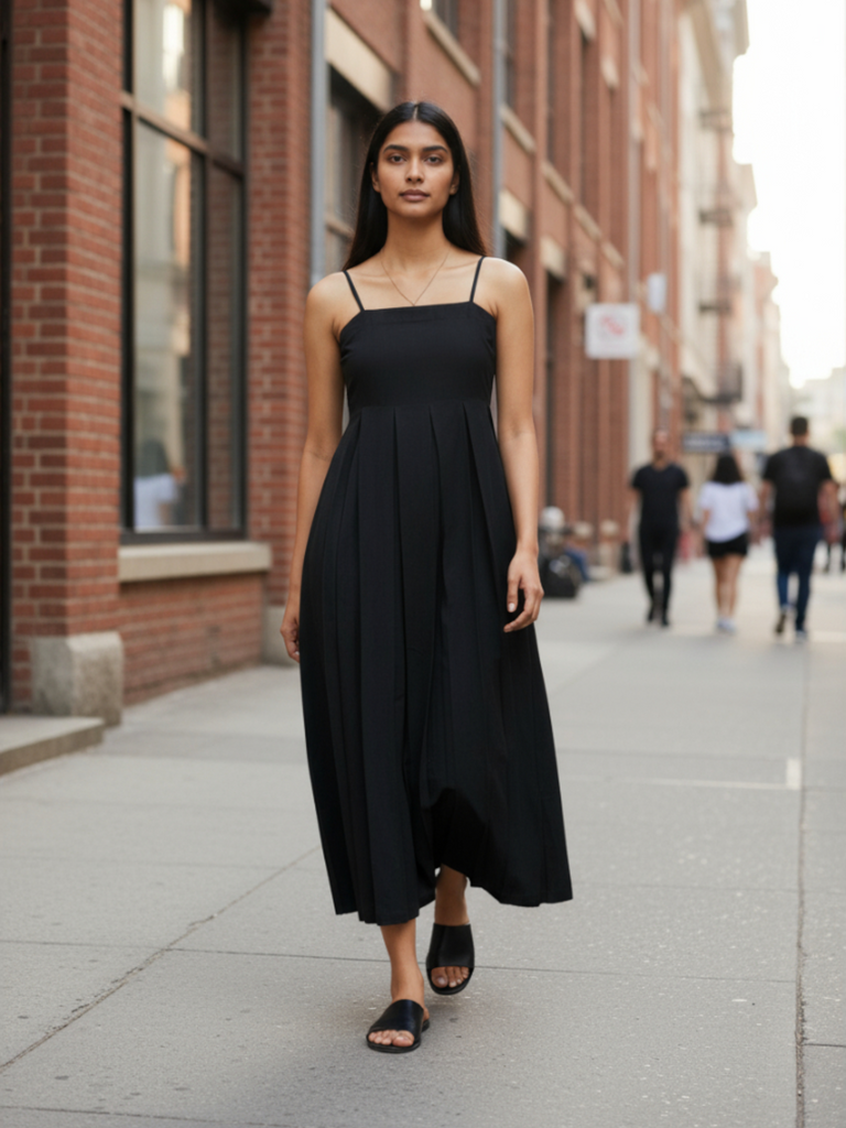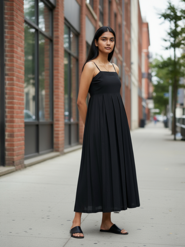 Make a statement in the classic and sophisticated Pia Dress. This midi dress features a strap style and wide box pleats, offering a comfortable and flattering fit. Crafted in a handwoven cotton fabric, the Pia Dress is both stylish and sustainable. So why wait? Add this must-have dress to your wardrobe today and enjoy effortless style that's both comfortable and sustainable.