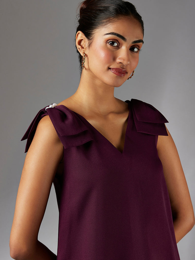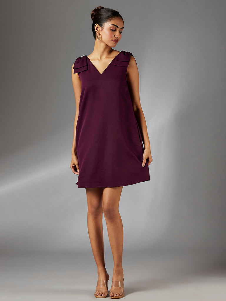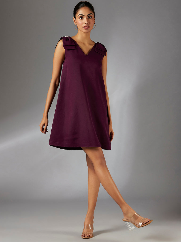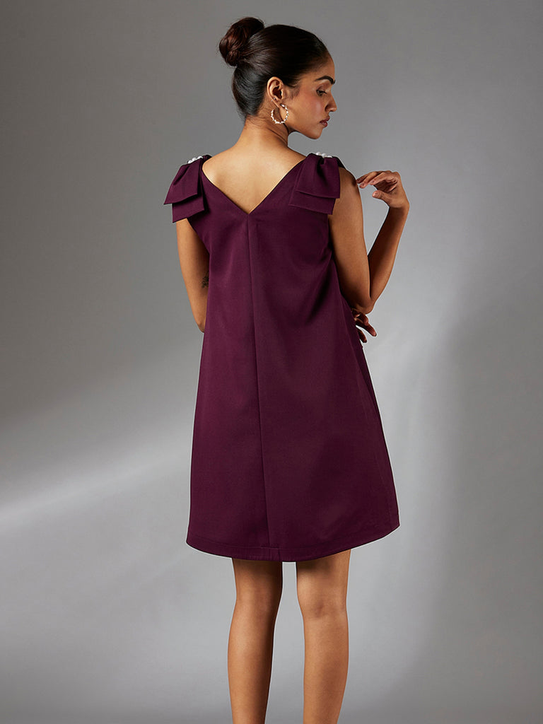 The Lux Edit: Add a touch of playful charm to your wardrobe with the Ann Mini Plum Dress. This adorable mini dress features sweet double bows on the shoulders, embellished with delicate white pearls for an elegant touch. Practical pockets add everyday functionality. The vibrant plum color and playful details make this a must-have for any fashion-forward woman.