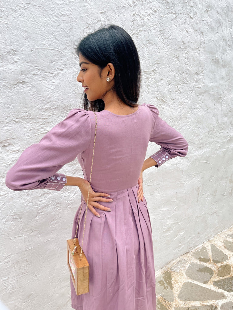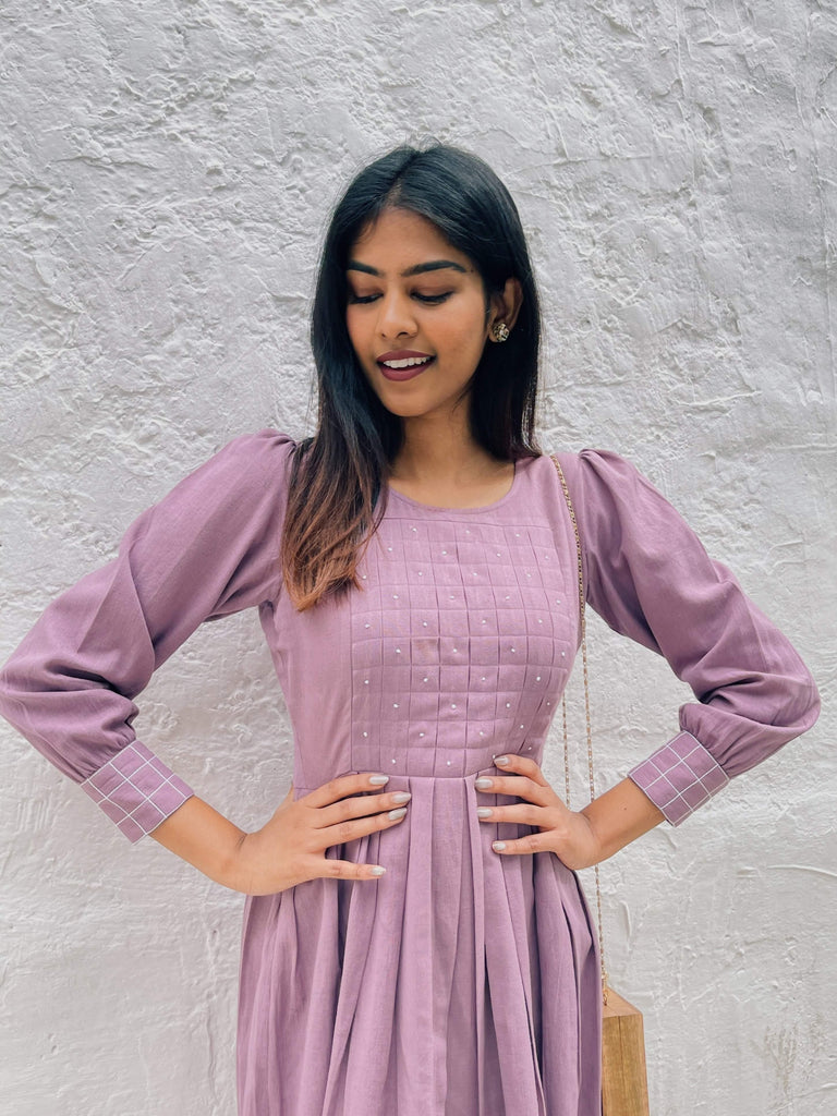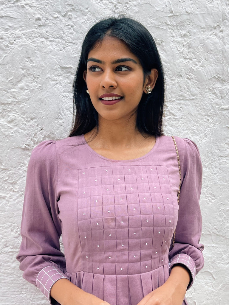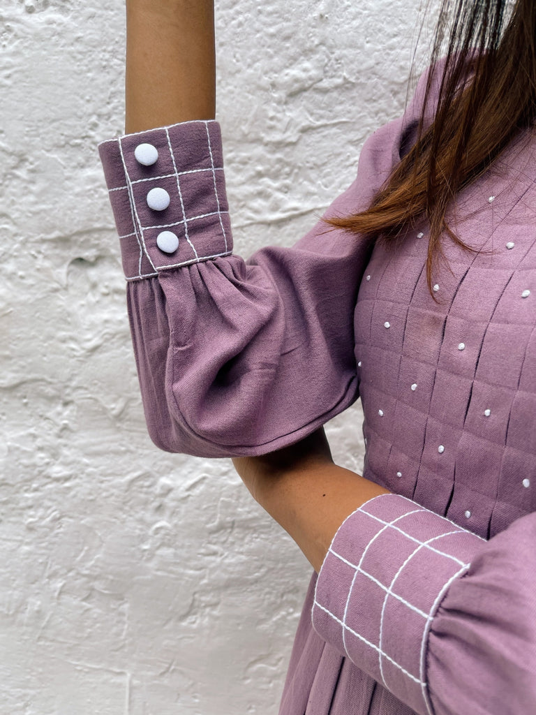 This lavender dress is crafted in cotton linen blend. It features a box pleat surface development on the front with intricately hand embroidered french knot on top along with a complimenting anchor works on the cuffs. Pair this top with your favorite pair of heels and earrings to complete your lunch date look
