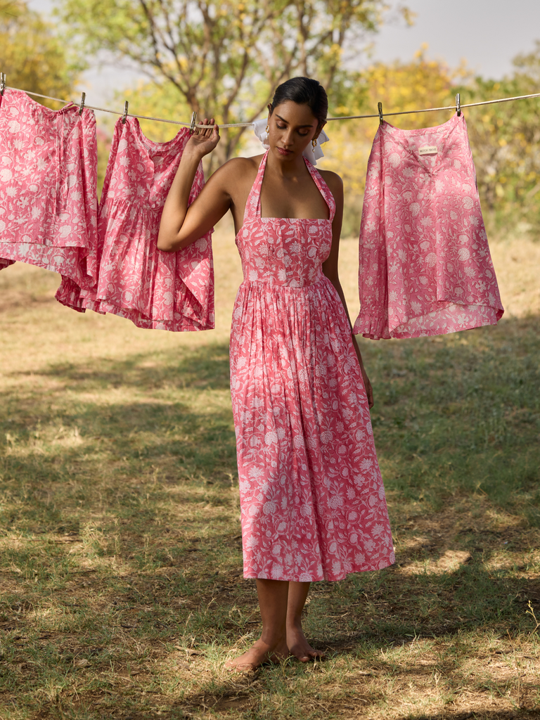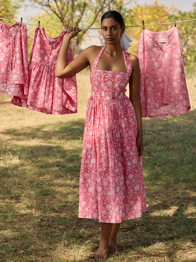 Ready to turn heads? The Petra Halter Corset Dress is your new power piece! This sleeveless midi, crafted from dreamy hand-block printed cotton, brings structured chic to the party. Boning? Oh yeah, it's got you covered for a killer silhouette. And that halter neckline? Hello, gorgeous shoulders! Think delicate jewels, heels, and BAM – a sophisticated evening look with an artistic twist. P.S. It has pockets! Shop Cotton Dresses Now.