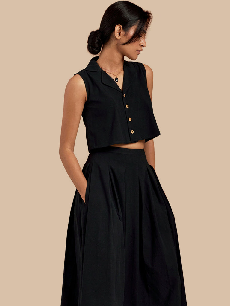 Introducing our Bri black sleeveless cropped top, a must-have for your summer wardrobe! Crafted in a pure handwoven fabric, this top is not only stylish but also sustainable. The front wooden button closure adds a touch of elegance to this already stunning piece. Pair it with high-waisted pants, skirts, or shorts for a chic and effortless look that's perfect for any occasion.