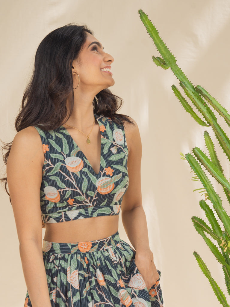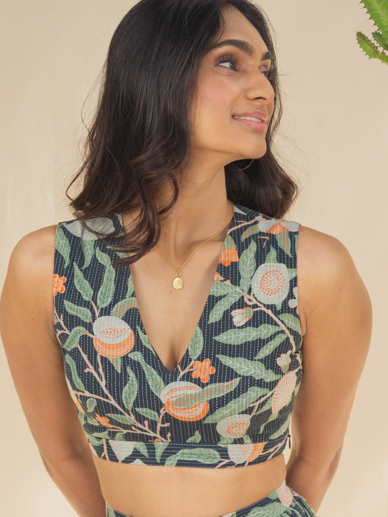 Introducing our Floral Printed Crop Top - a must-have addition to your summer wardrobe. Crafted in a soft cotton azo-free fabric, this top is both stylish and eco-friendly. The beautiful floral print accentuates the V-neckline and included padding create a flattering and feminine silhouette. The back zip opening adds a touch of sophistication and makes it easy to slip on and off. Easy to pair as a blouse for sarees as well.