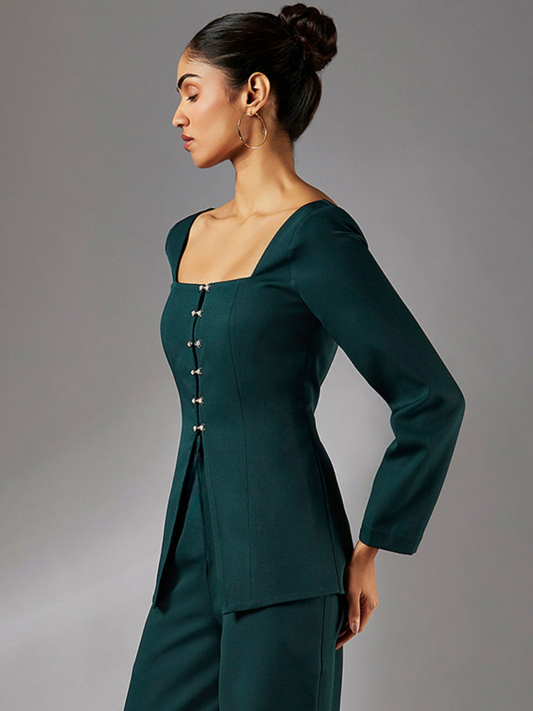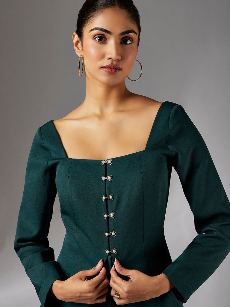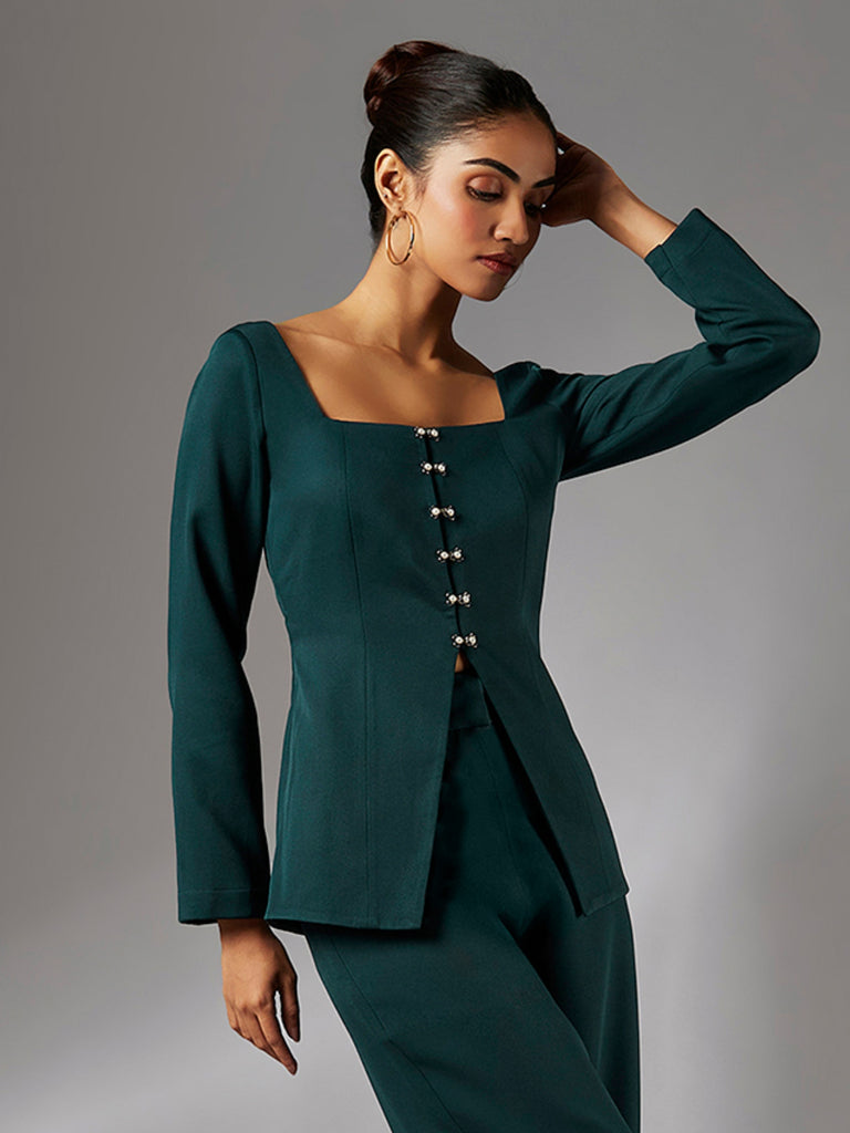 Elevate your evening wardrobe with the sophisticated Jolene Top. Featuring a chic square neckline and exquisite pearl detailing, this top creates a captivating focal point. The timeless full sleeves and luxurious fabric ensure both comfort and style. Perfect for women seeking elegant evening wear. Pair with tailored trousers or a flowing skirt for a polished look.