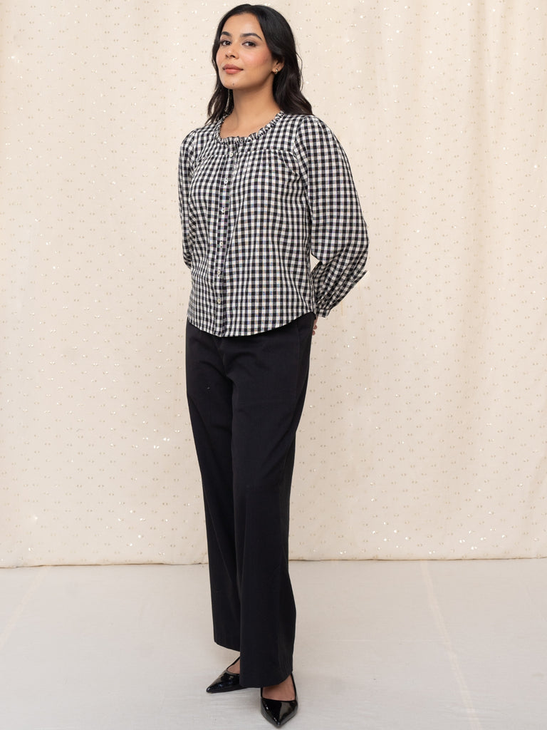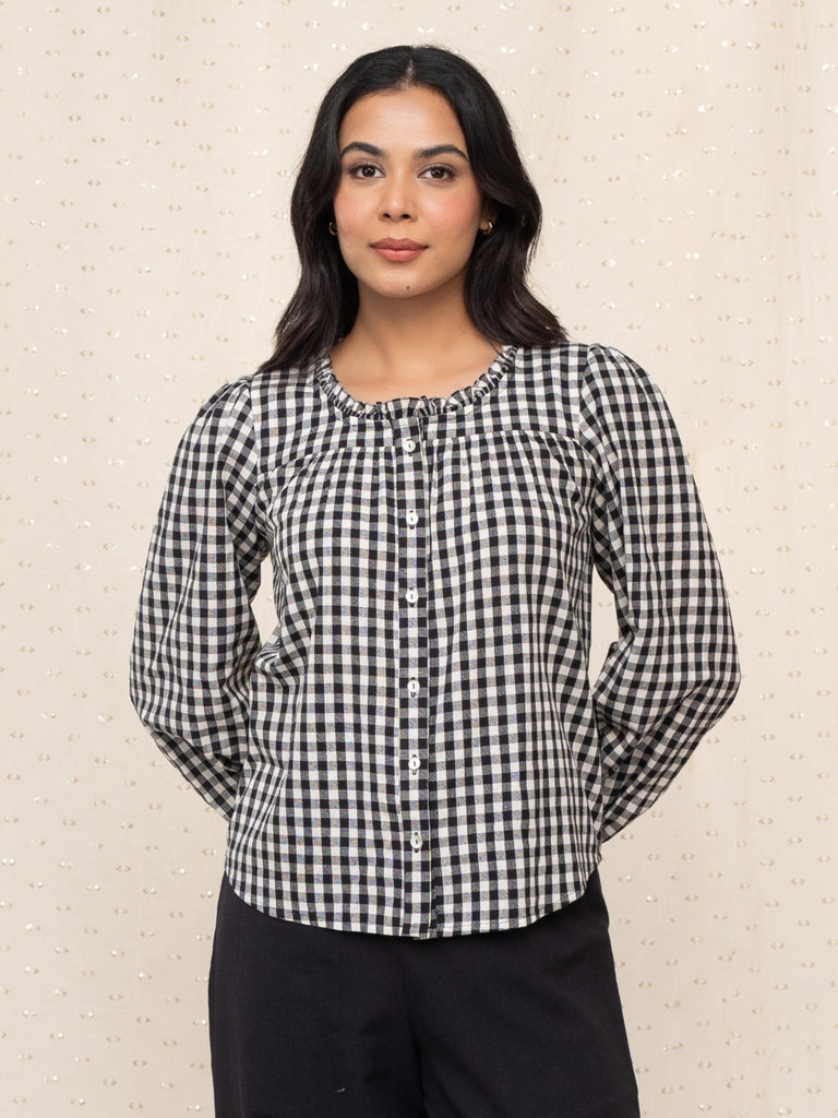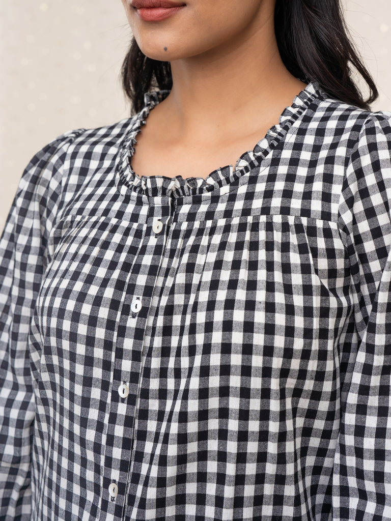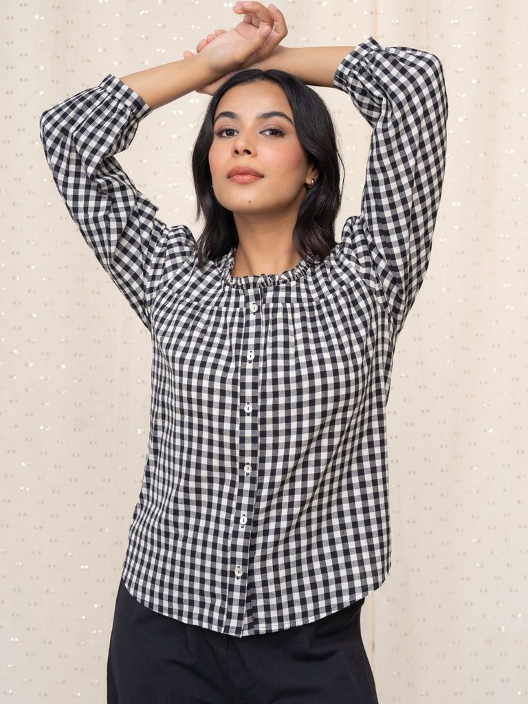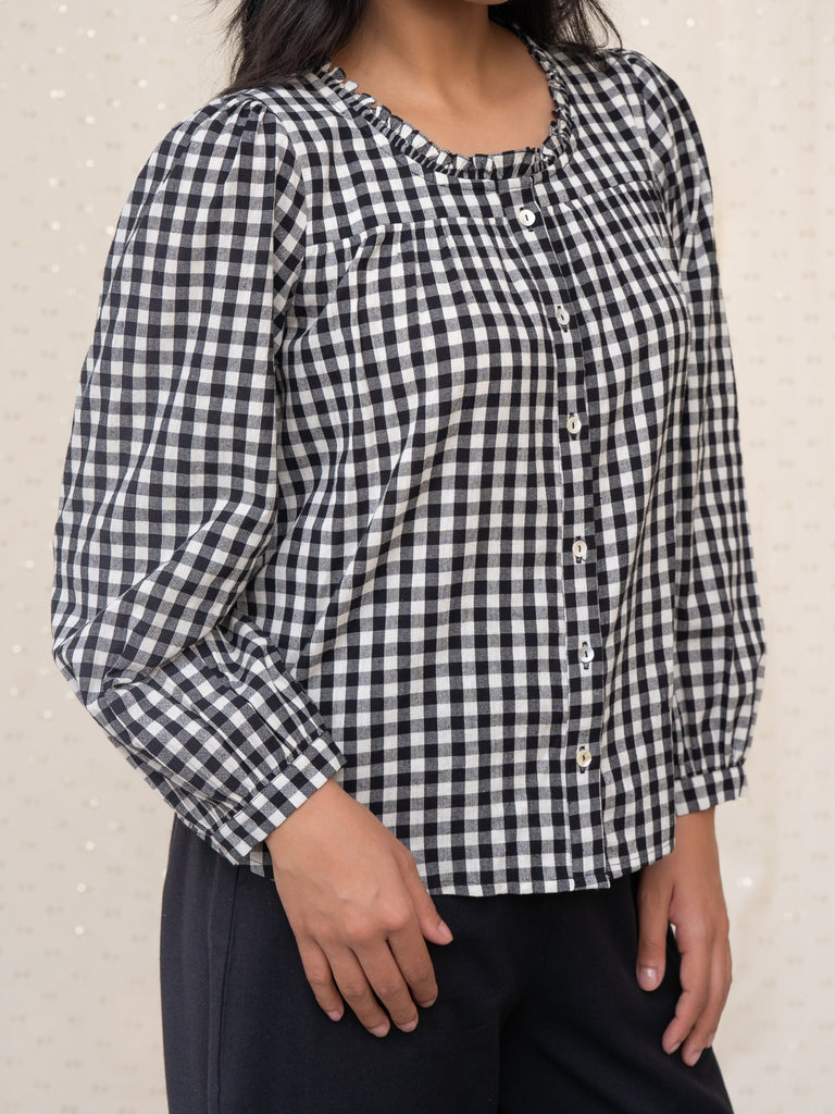 The Shay Ruffle Collar Top offers a delightful blend of classic design and chic detailing. Crafted from a beautiful handwoven black and white check cotton, this top exudes a sophisticated yet approachable charm. Delicate ruffles adorning the neckline add a touch of playful elegance, elevating this timeless piece beyond the ordinary.