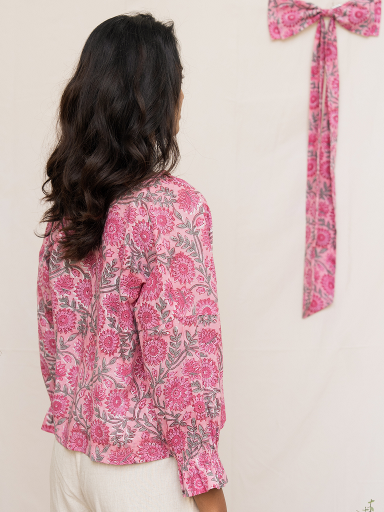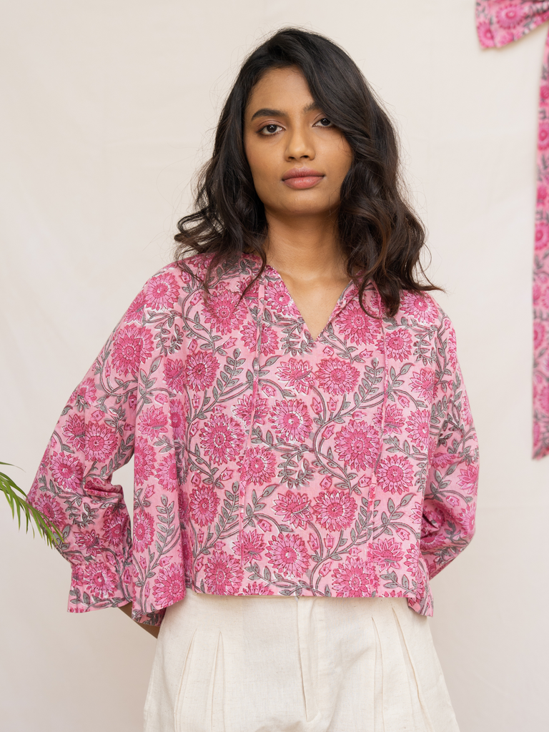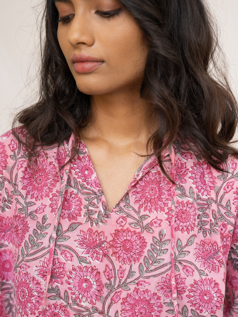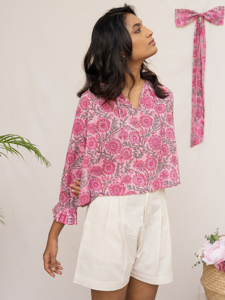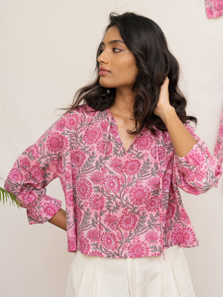 This delightful top is crafted from a soft cotton block printed with a delicate pink floral pattern. The easy drop shoulder and full sleeves, complete with an elasticated yoke and a sweet ruffle at the hem, offer both comfort and a touch of whimsy. The bright and happy floral print makes this top an irresistible choice for adding a stylish and cheerful touch to your summer look.
