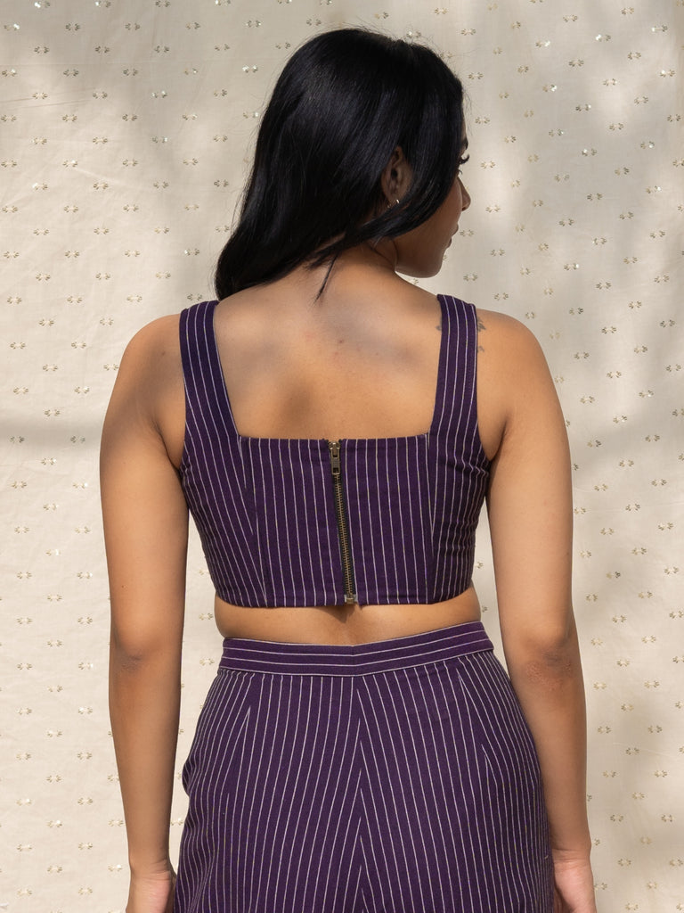 The Odessa Corset Top: A captivating statement piece. Crafted in a stunning purple woven striped fabric, this top features a structured silhouette with a square neckline, boning for support, and an antique metallic zipper. Perfect for a night out or a special occasion.