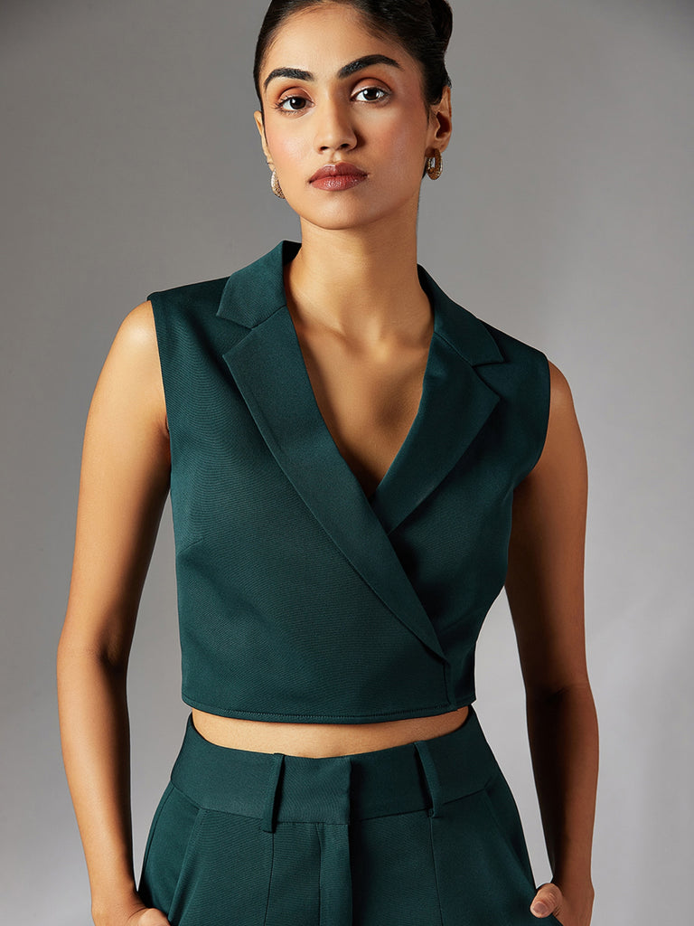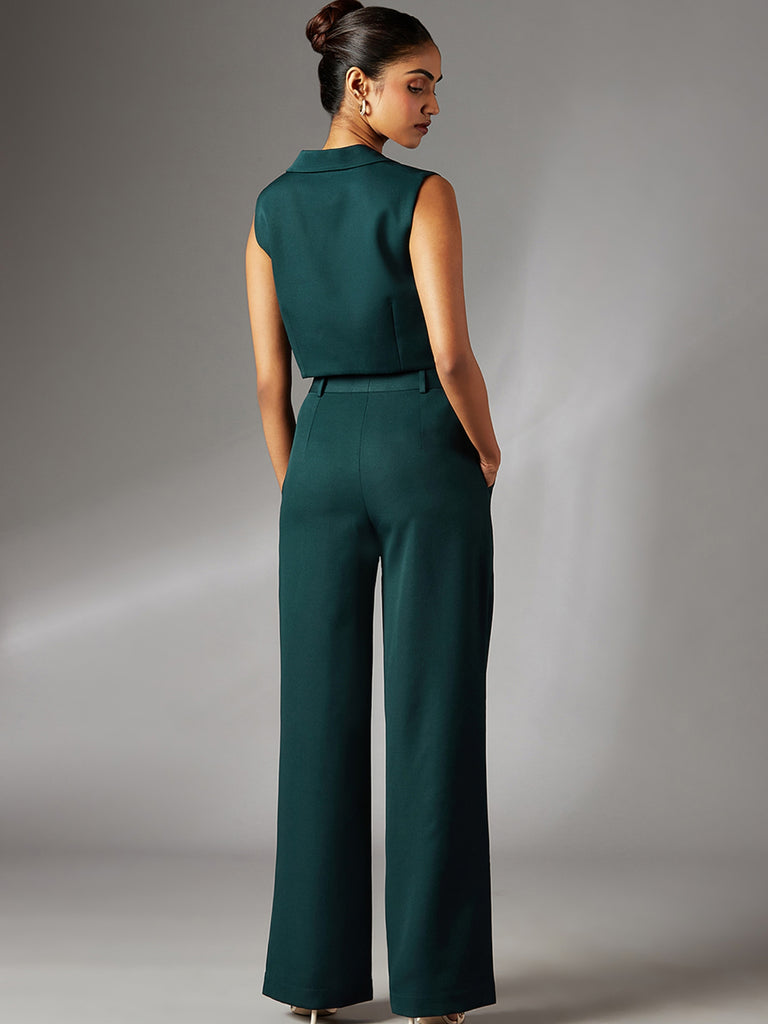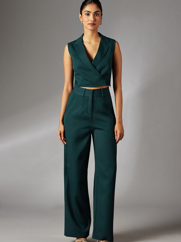 Channel effortless California cool with the Cali Co-ord Set, a chic and modern ensemble featuring a non-functional cropped jacket-style crop top and wide-leg pants. Crafted from luxurious Italian banana crepe, this set exudes sophistication and style. The cropped top adds a playful touch, while the wide-leg pants create a flattering and ontrend silhouette. The stunning wide waist belt cinches the waist for a feminine and figurehugging look. This versatile set is perfect for a variety of occasions, from casual outings to stylish events.